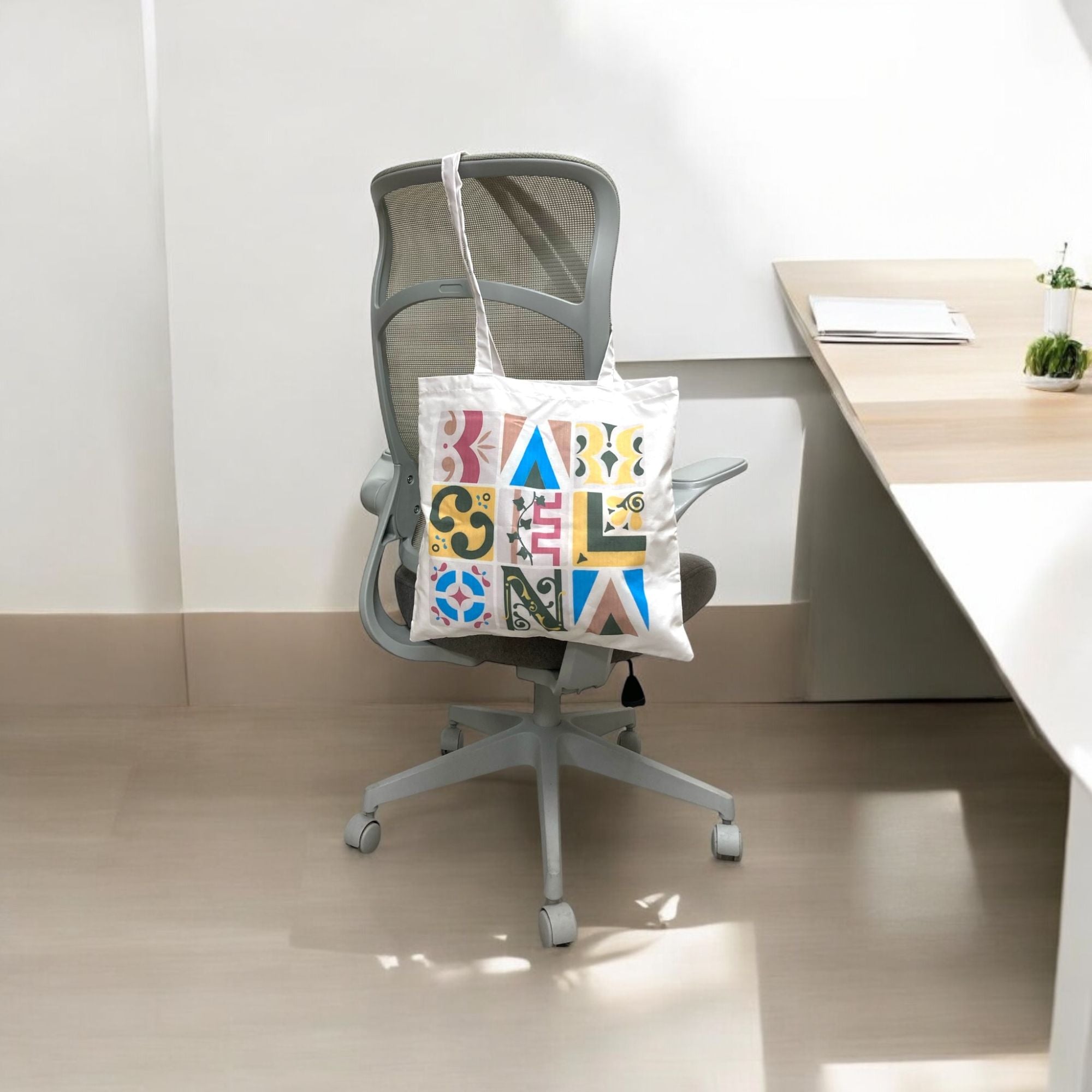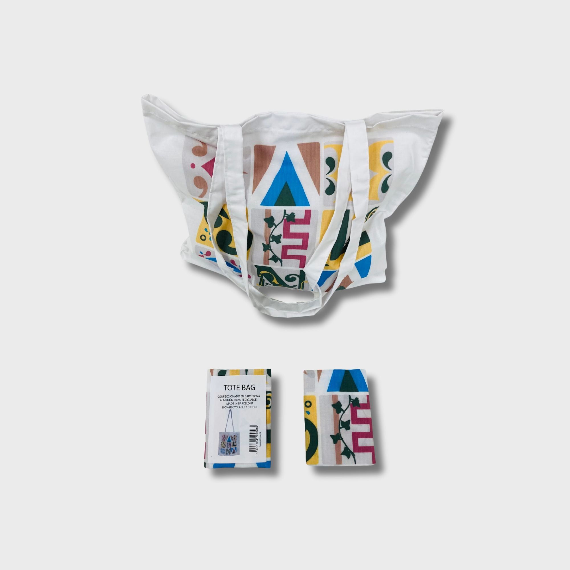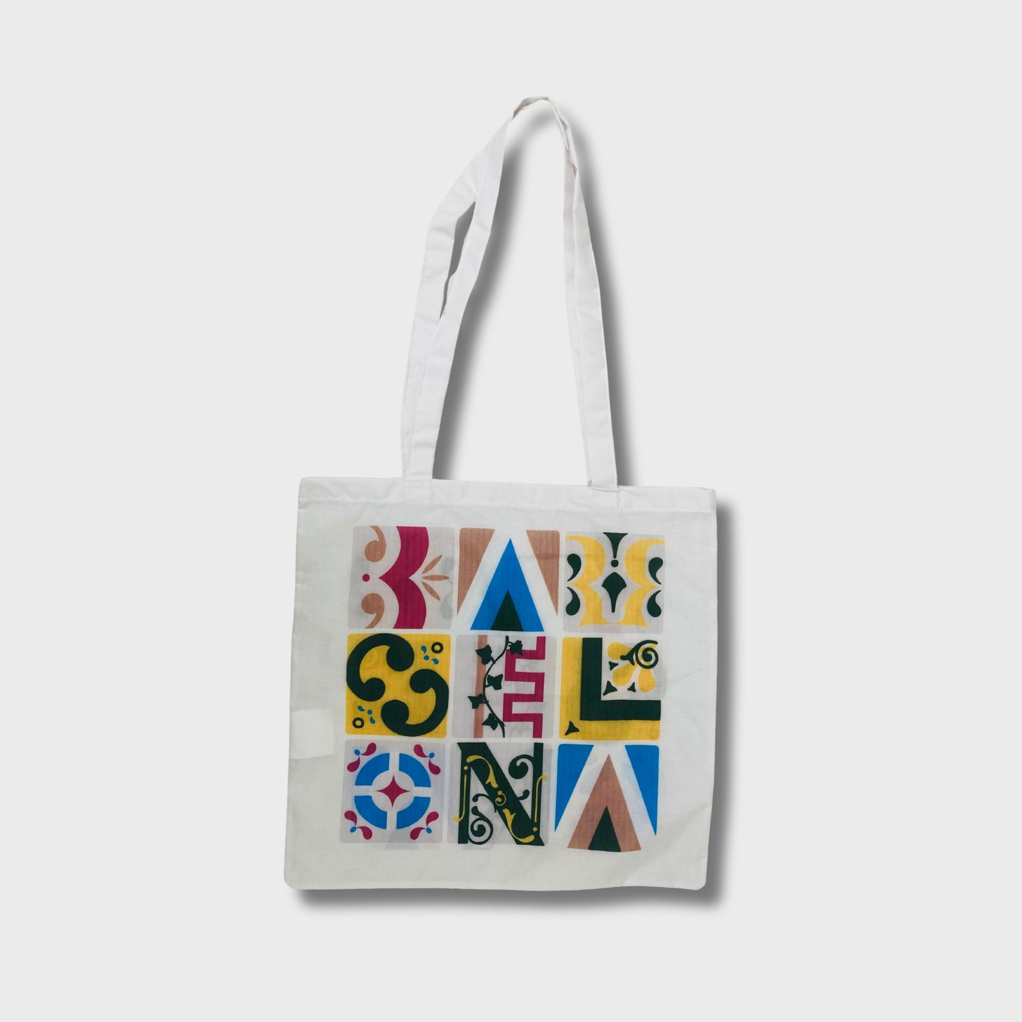 Bolsa de algodón blanco 100% y de 120gr. De medidas 40cm x 40cm con asa larga. El diseño está presente en toda la bolsa incluyendo la asa. La confección de este artículo está hecha íntegramente en Barcelona.