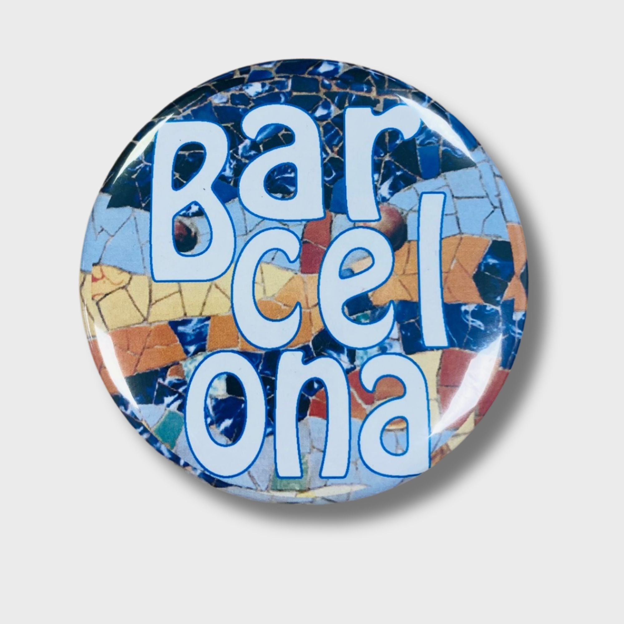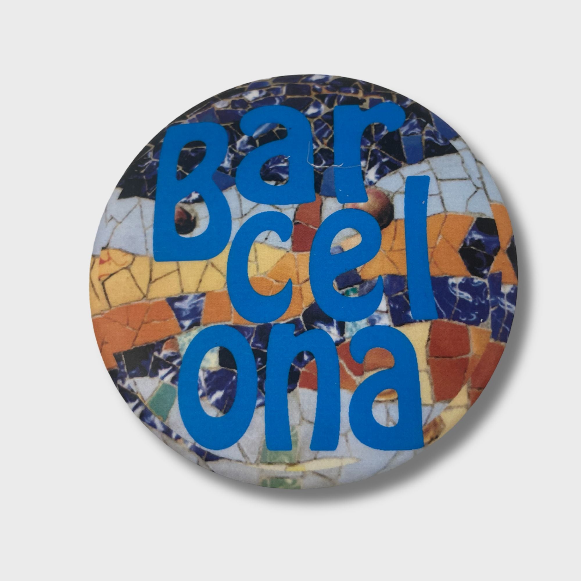 Iman redondo metálico con acabado mate, de diámetro 38mm, 59mm, 75mm o 59mm con abrebotellas. Disponible con el nombre de Barcelona en blanco o azul.