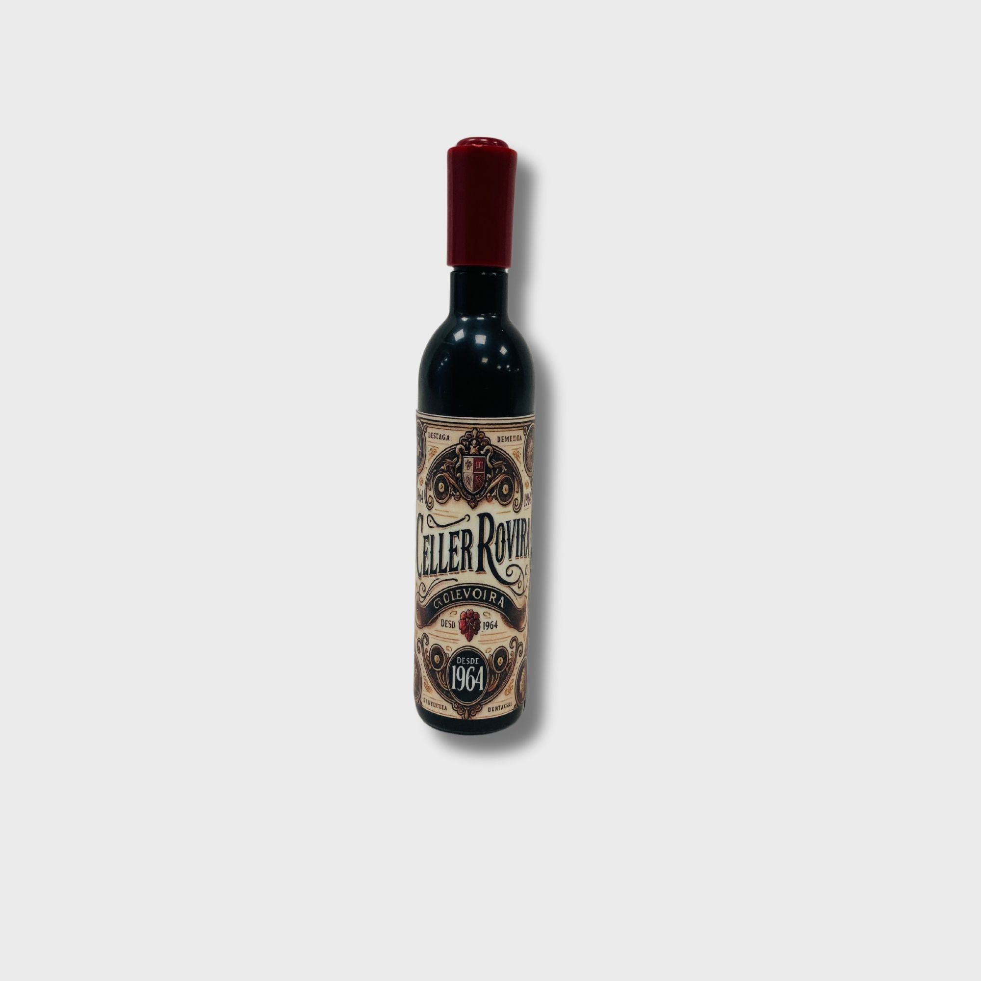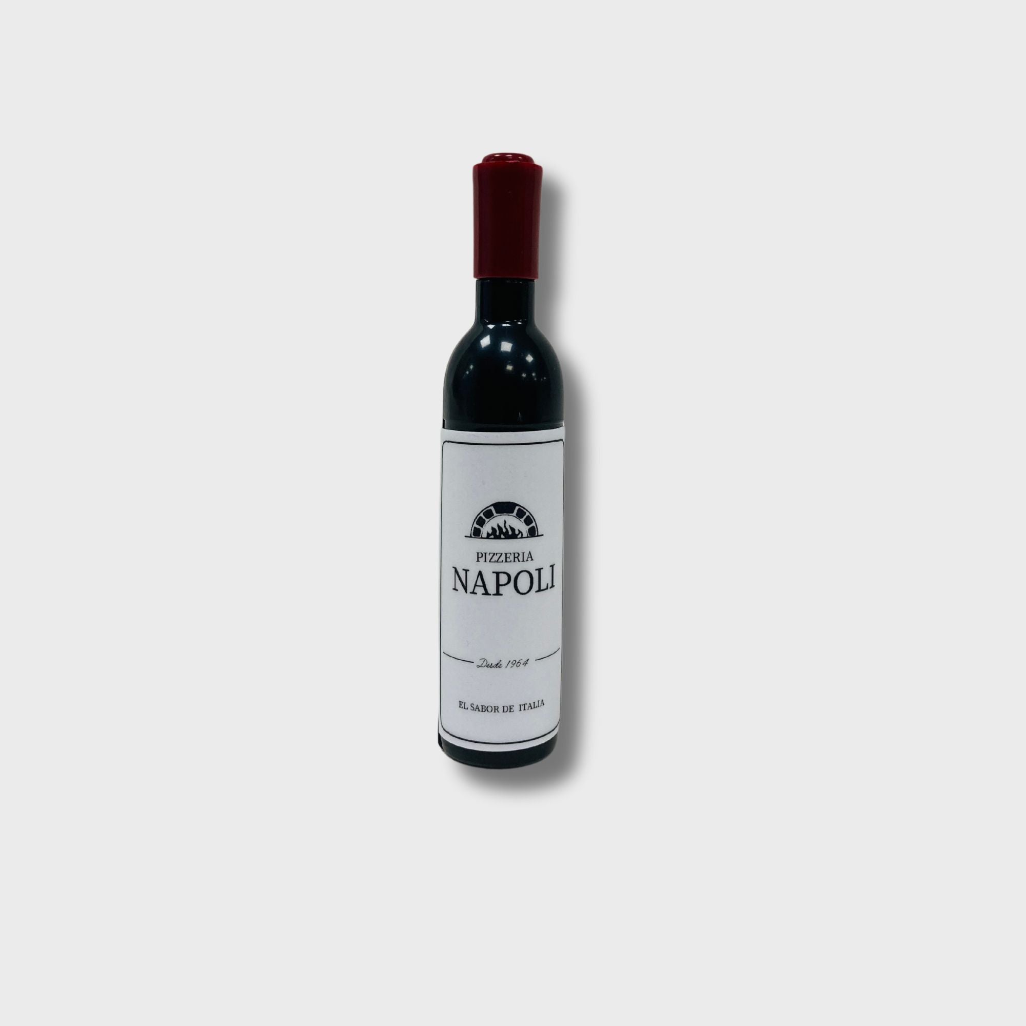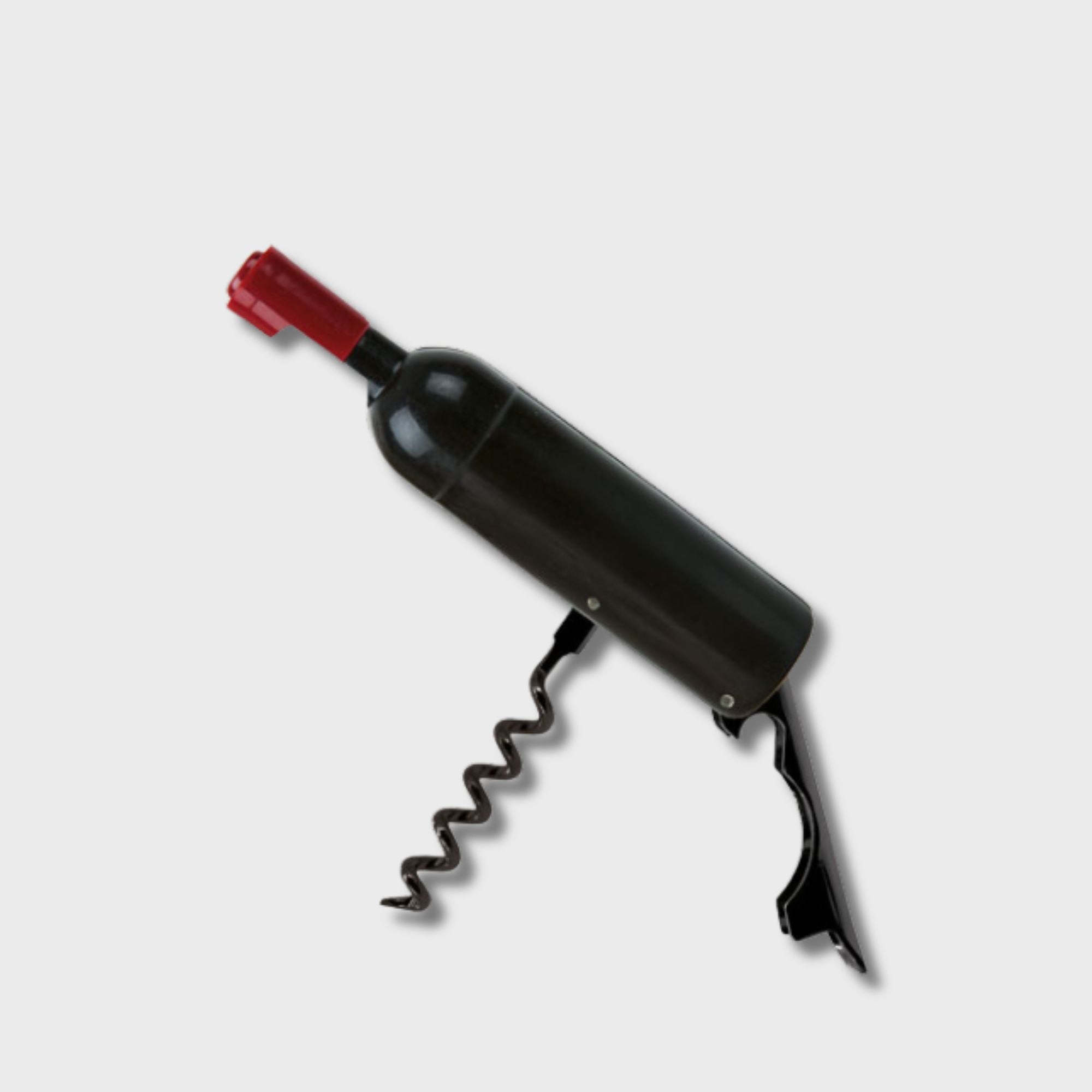 Practico sacacorchos y abridor de botellas de acero, con forma de botella de vino. De color negro con el tapón rojo y medidas de 2.40 x 11.50cm.