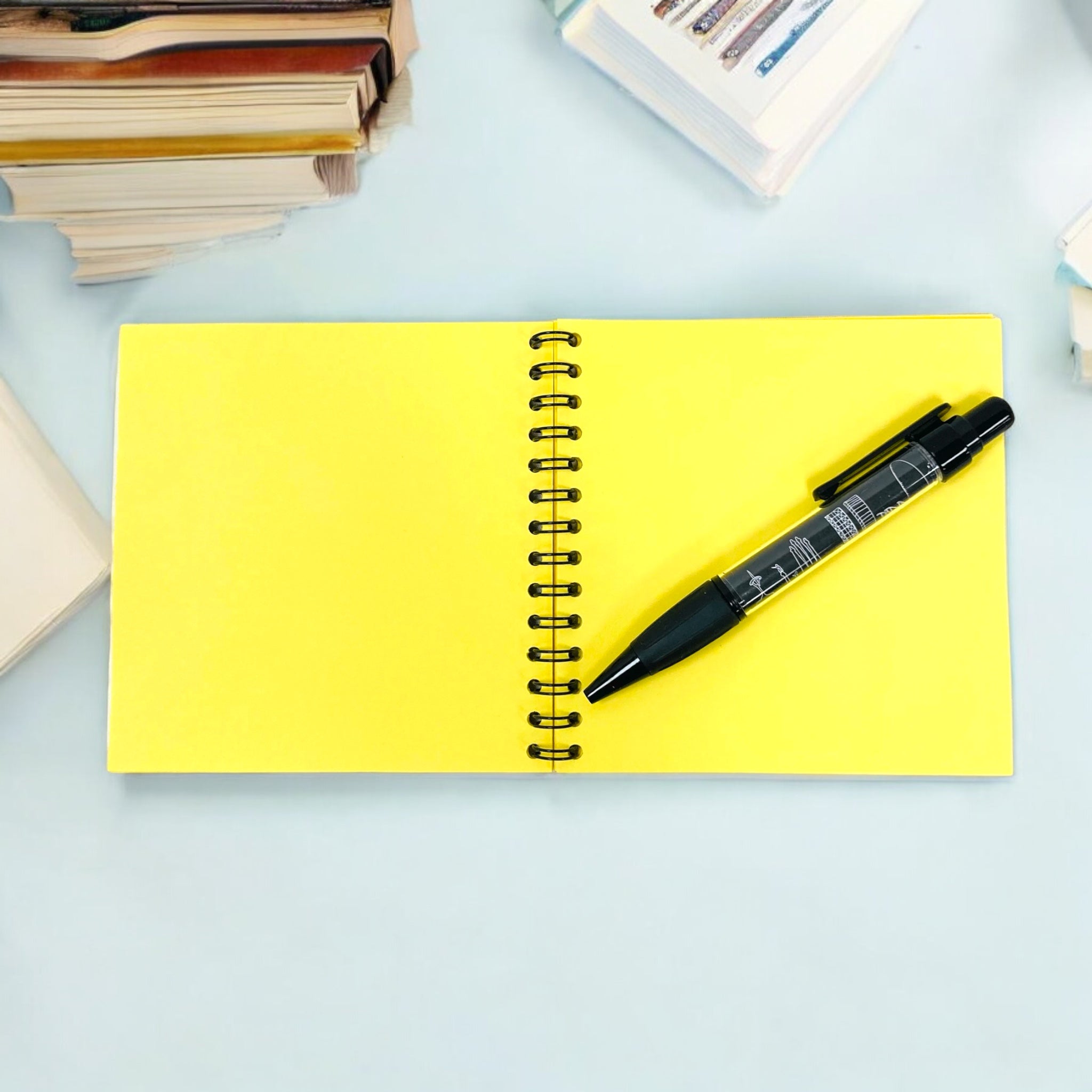 Libreta de medidas 12x12cm con 50 hojas amarillas offset de 80 gramos, se unen en la parte lateral con espiral metálica. Ideal para llevar en el bolso y tomar breves notas.