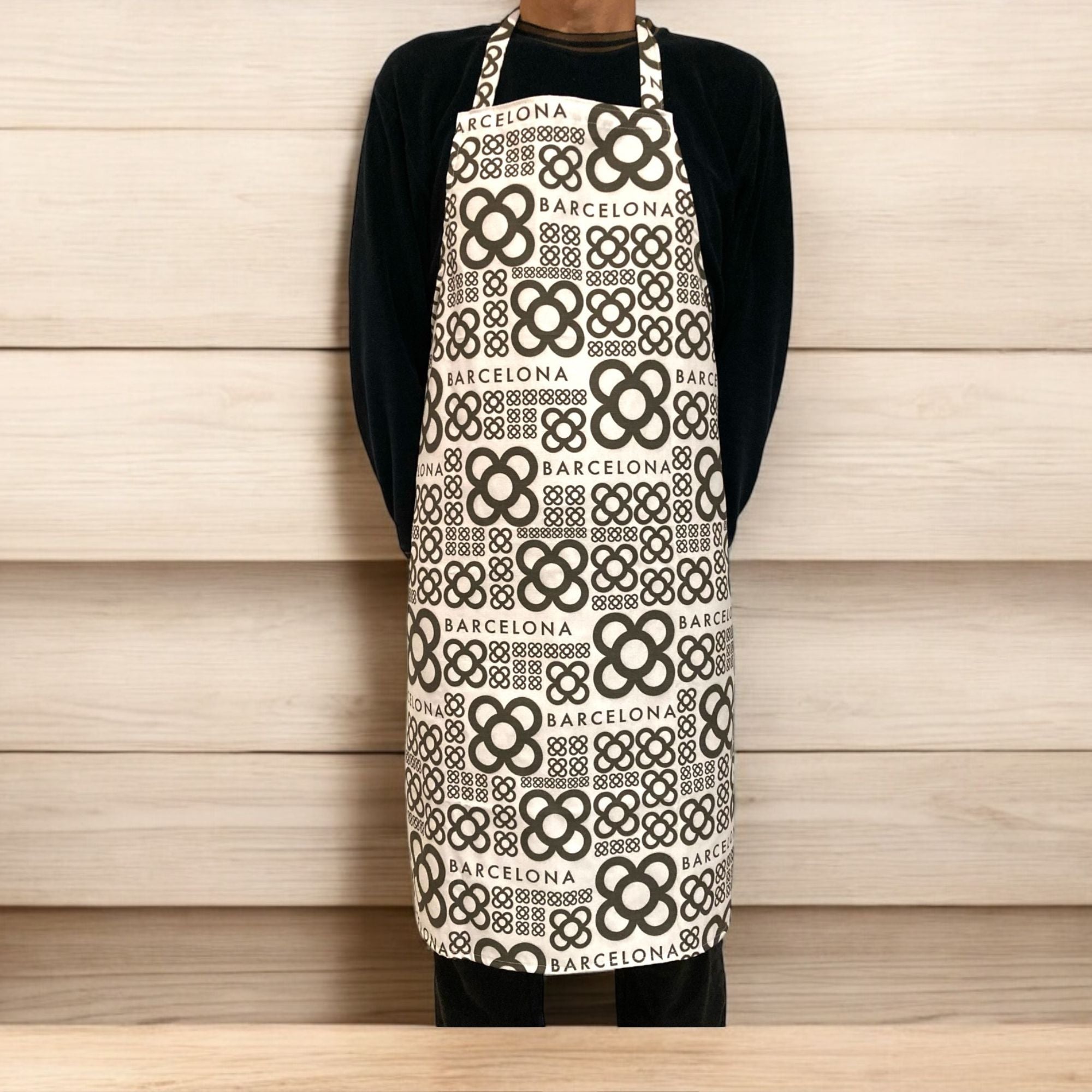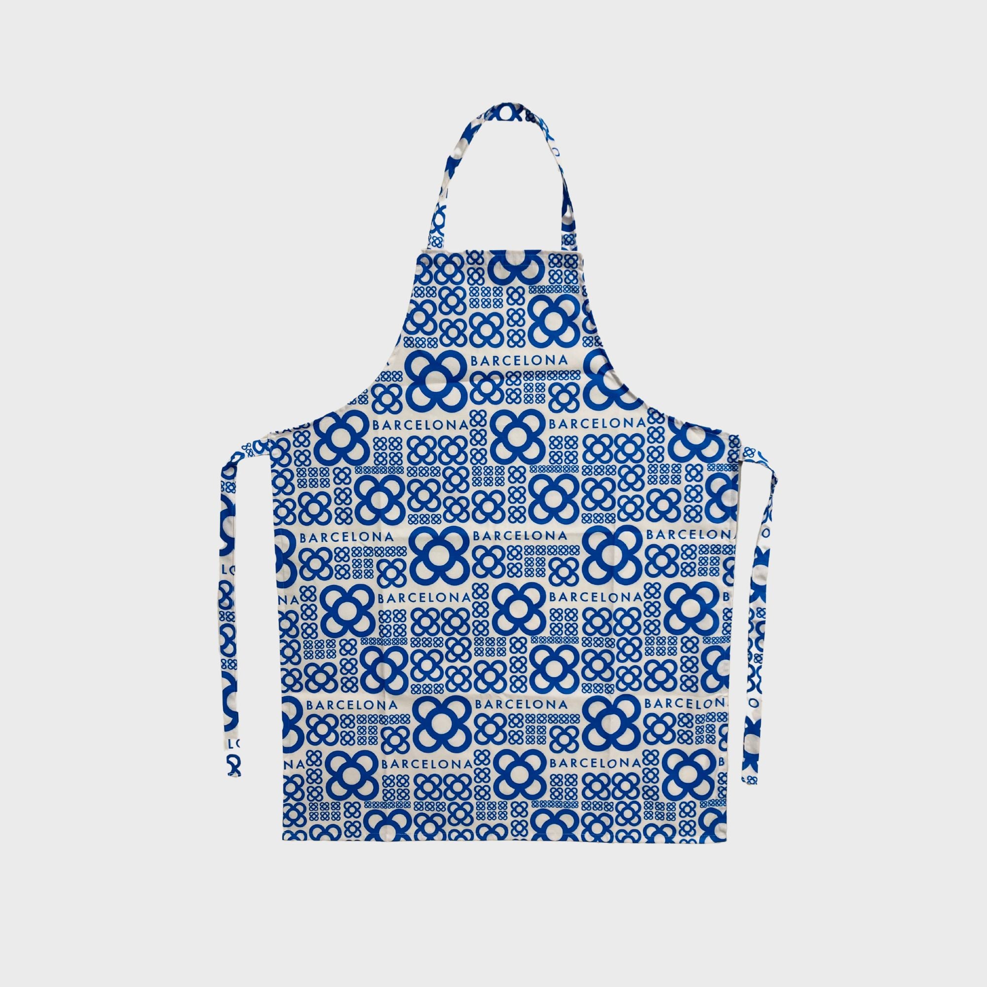Atractivo delantal de cocina unisex de 100% algodón blanco. De medidas 65cm de ancho x 85cm de largo con amplias cintas para atar perfectamente alrededor de la cintura, confeccionada íntegramente en Barcelona. Disponible en cuatro colores.