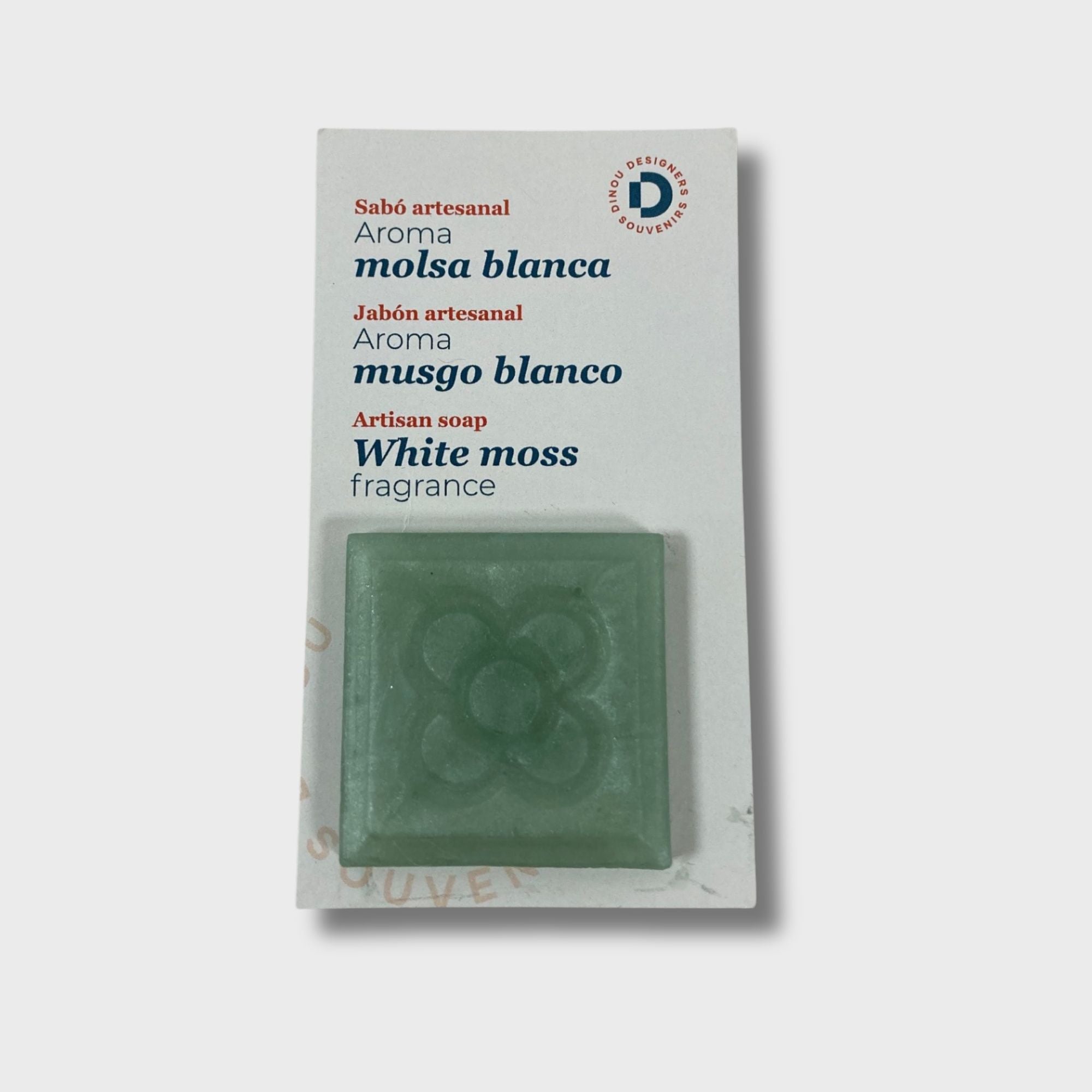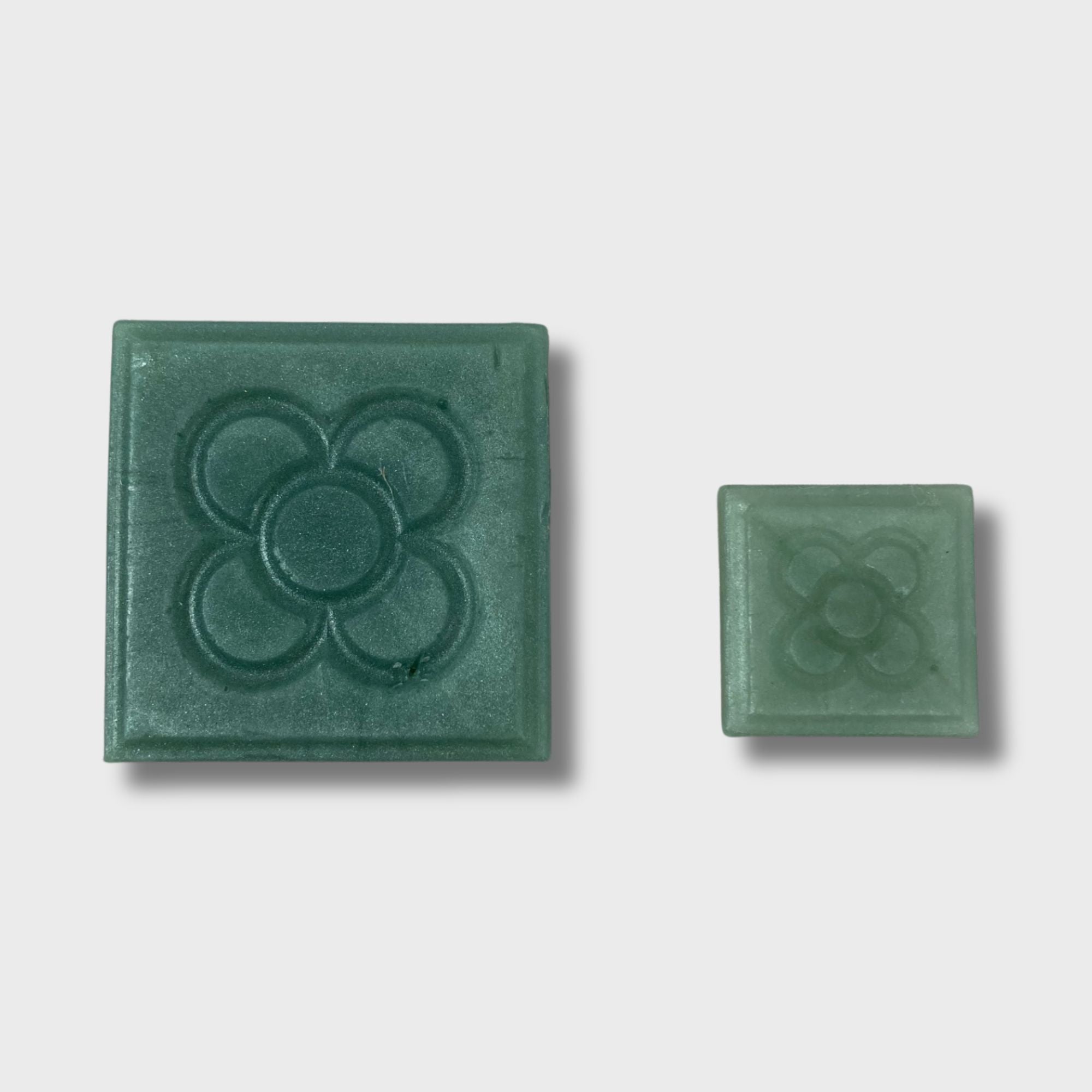 Jabón de glicerina natural sin sulfatos ni parabenos, fabricado artesanalmente a mano, con micas y fragancia de musgo blanco de color verde. Medidas 3.5cm x 3.5cm el pequeño y 6cm x 6cm el grande.