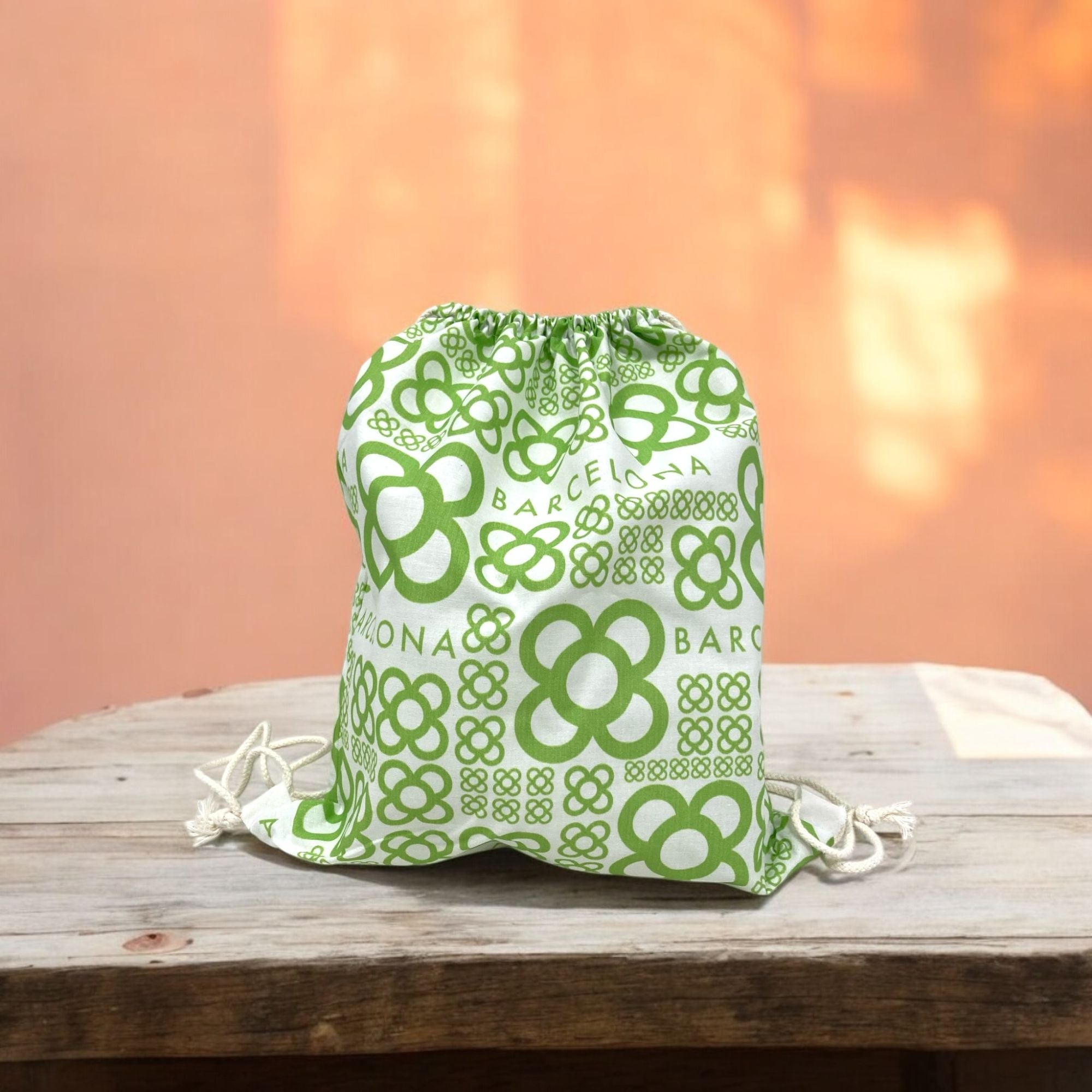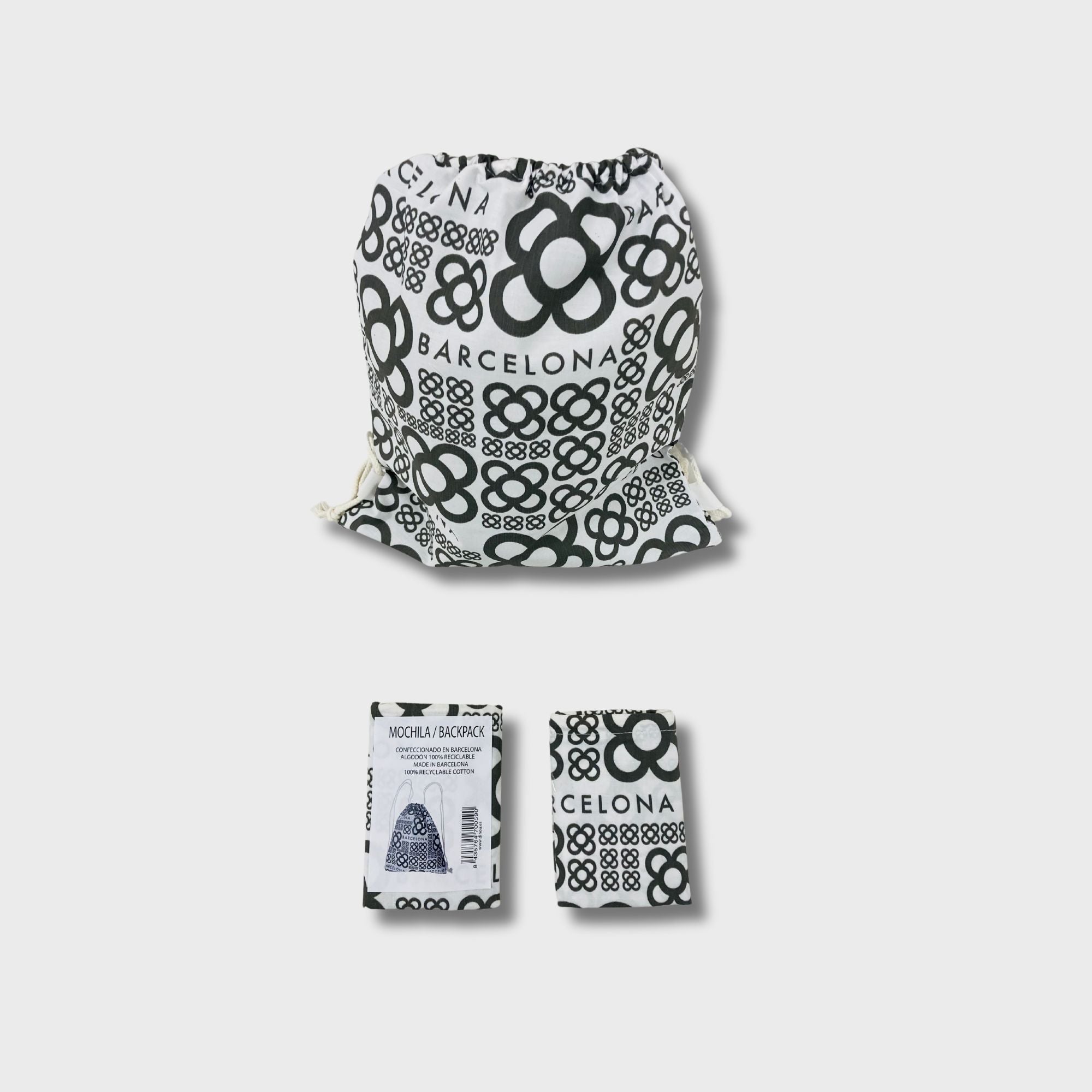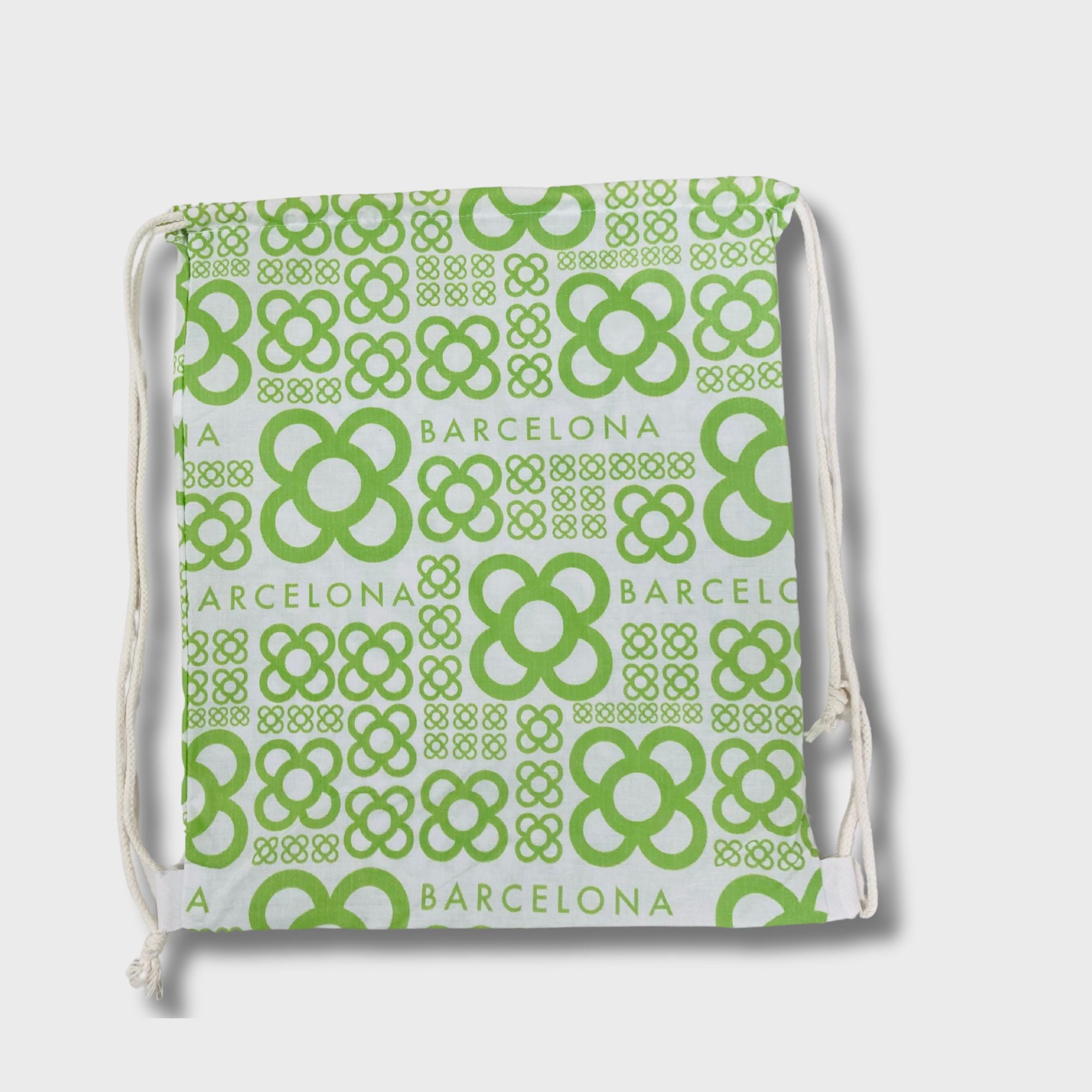 Mochila de algodón blanco 100% y 120gr. De medidas 33cm x 40cm con asas de cordón. El diseño está presente en toda la bolsa. La confección de este artículo está hecha íntegramente en Barcelona. Disponible en cuatro colores.