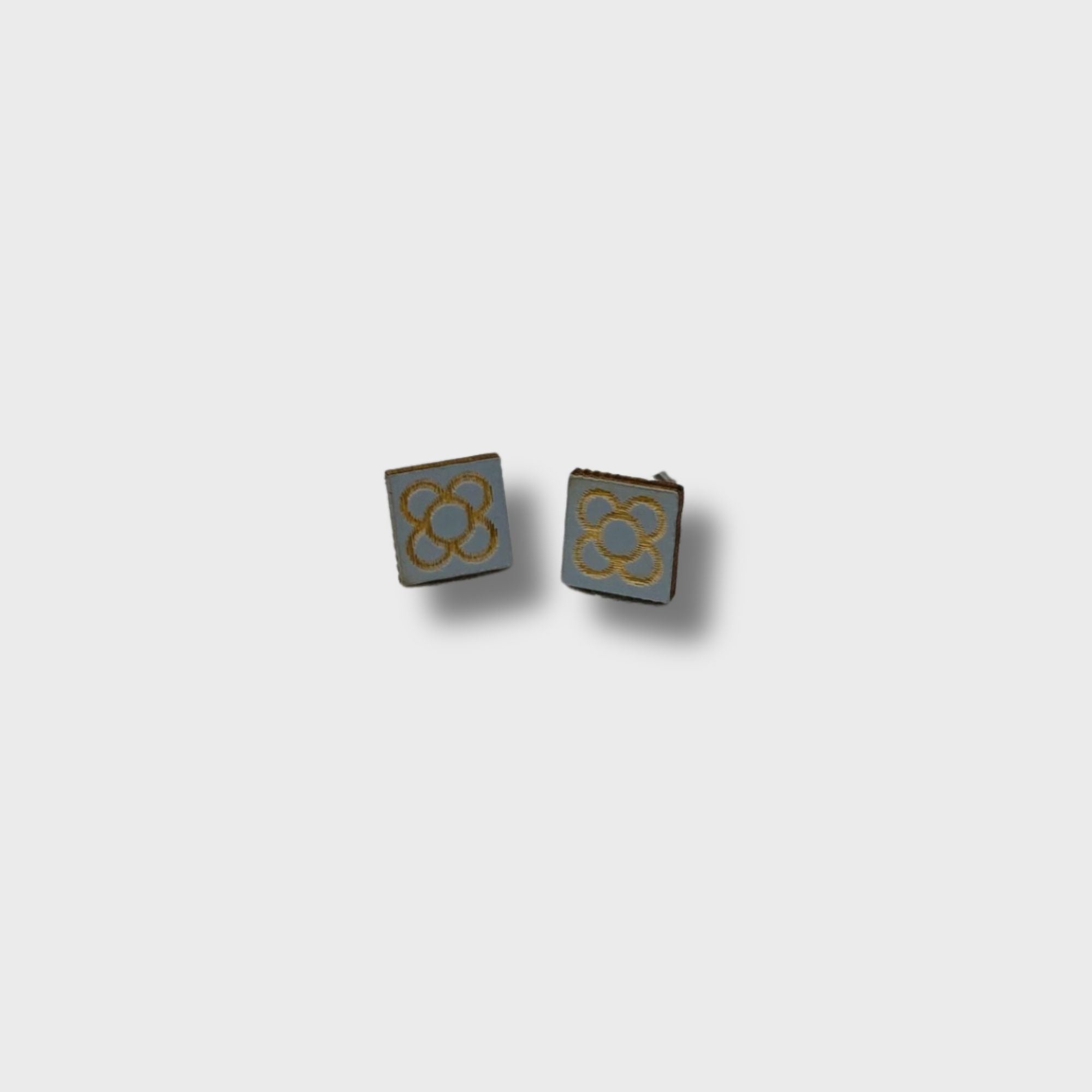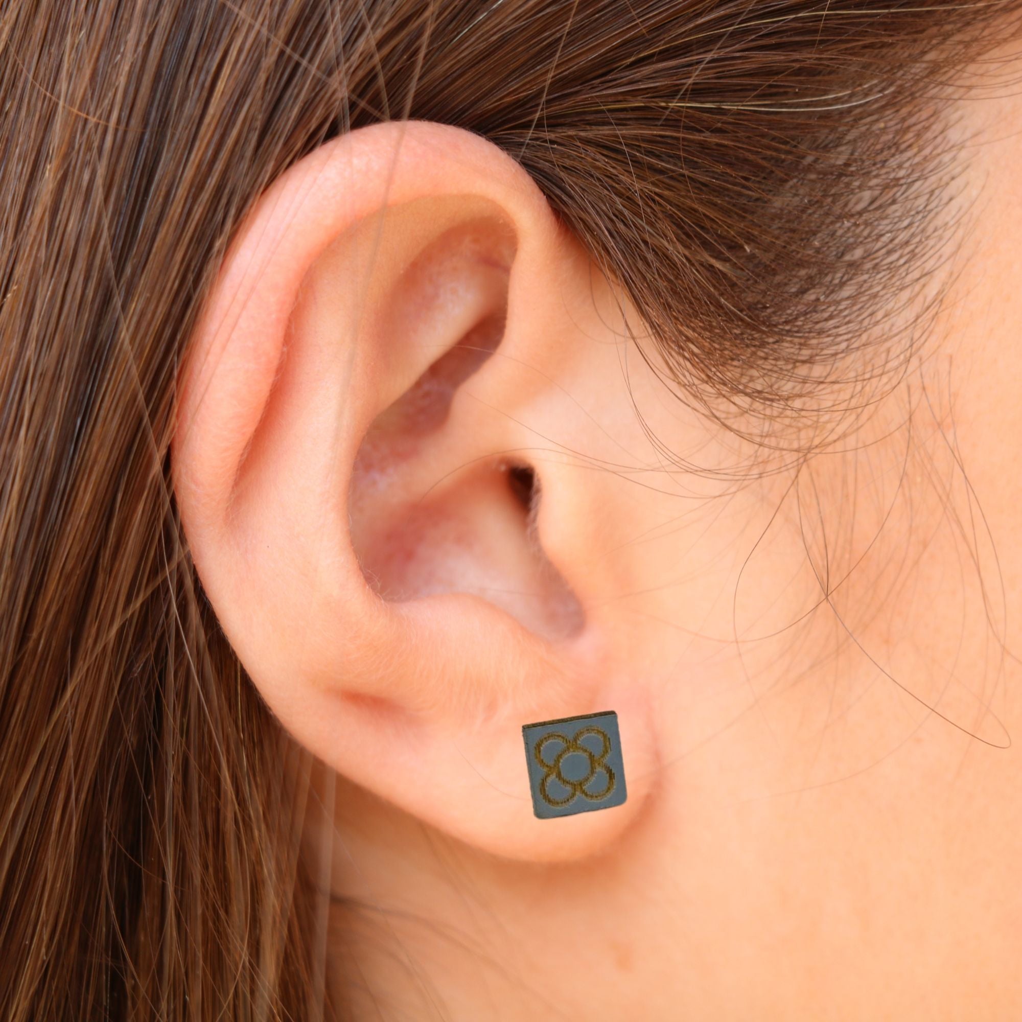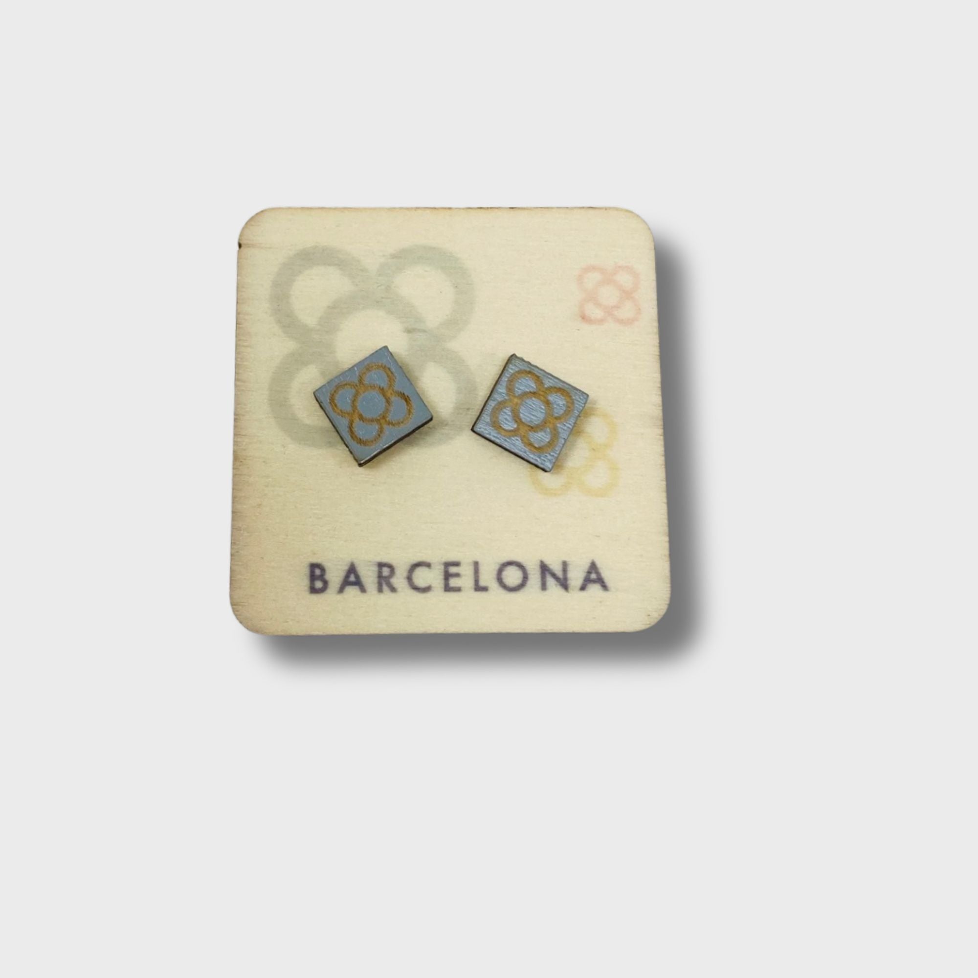 Pendientes de madera de medida 10mm x 10mm con cierre de acero. Con el dibujo de las típicas losetas de Barcelona diseñadas por el arquitecto Josep Puig i Cadafalch, en color gris.