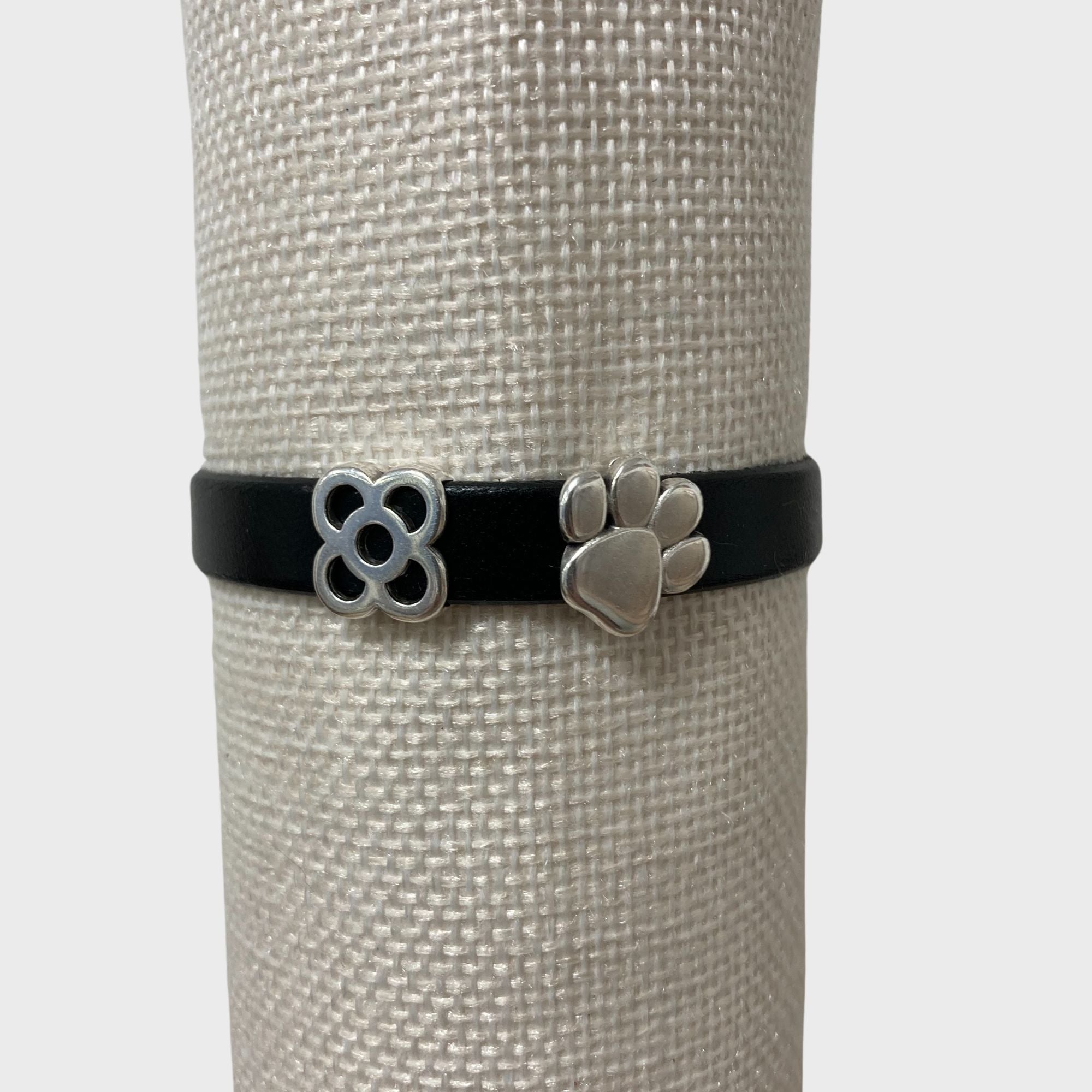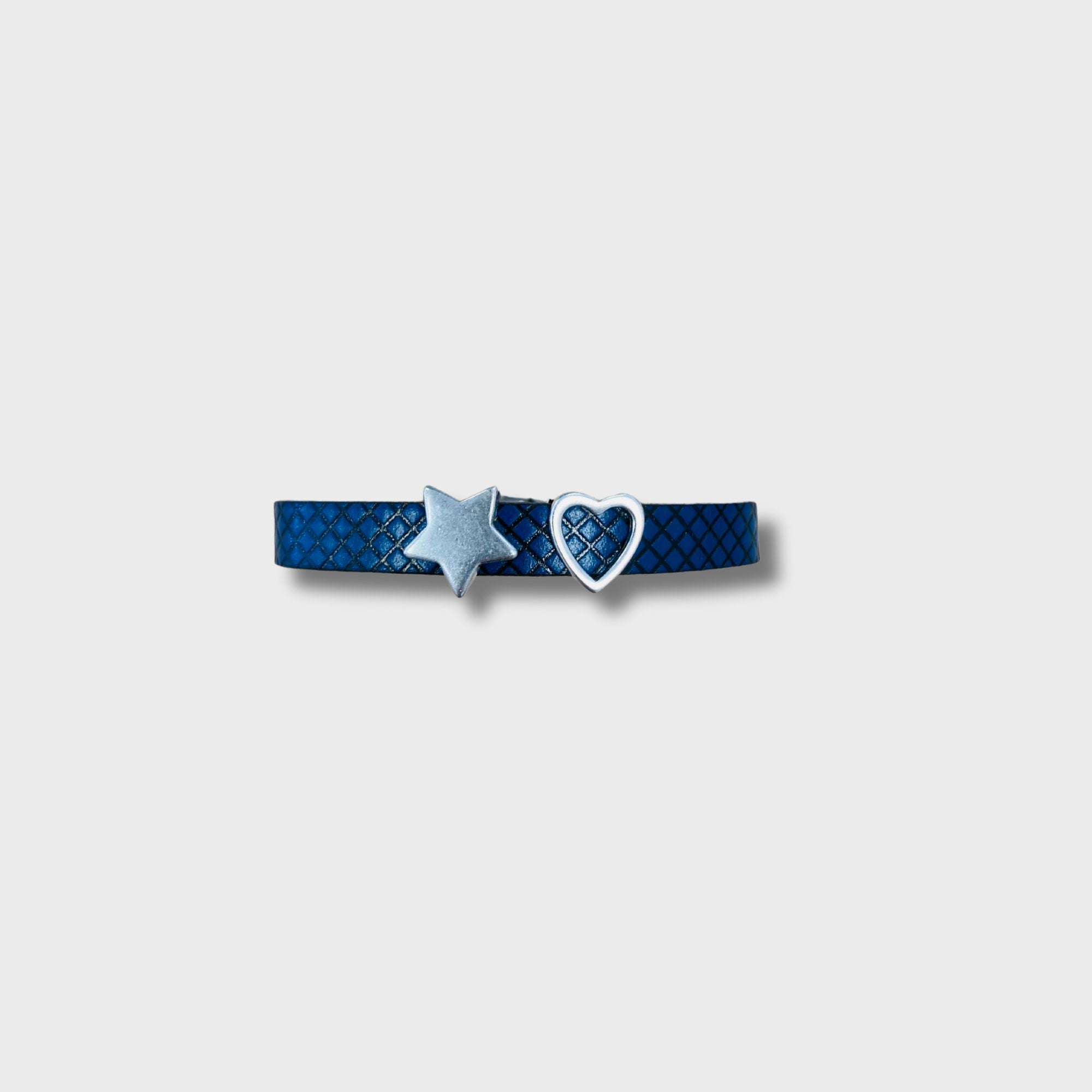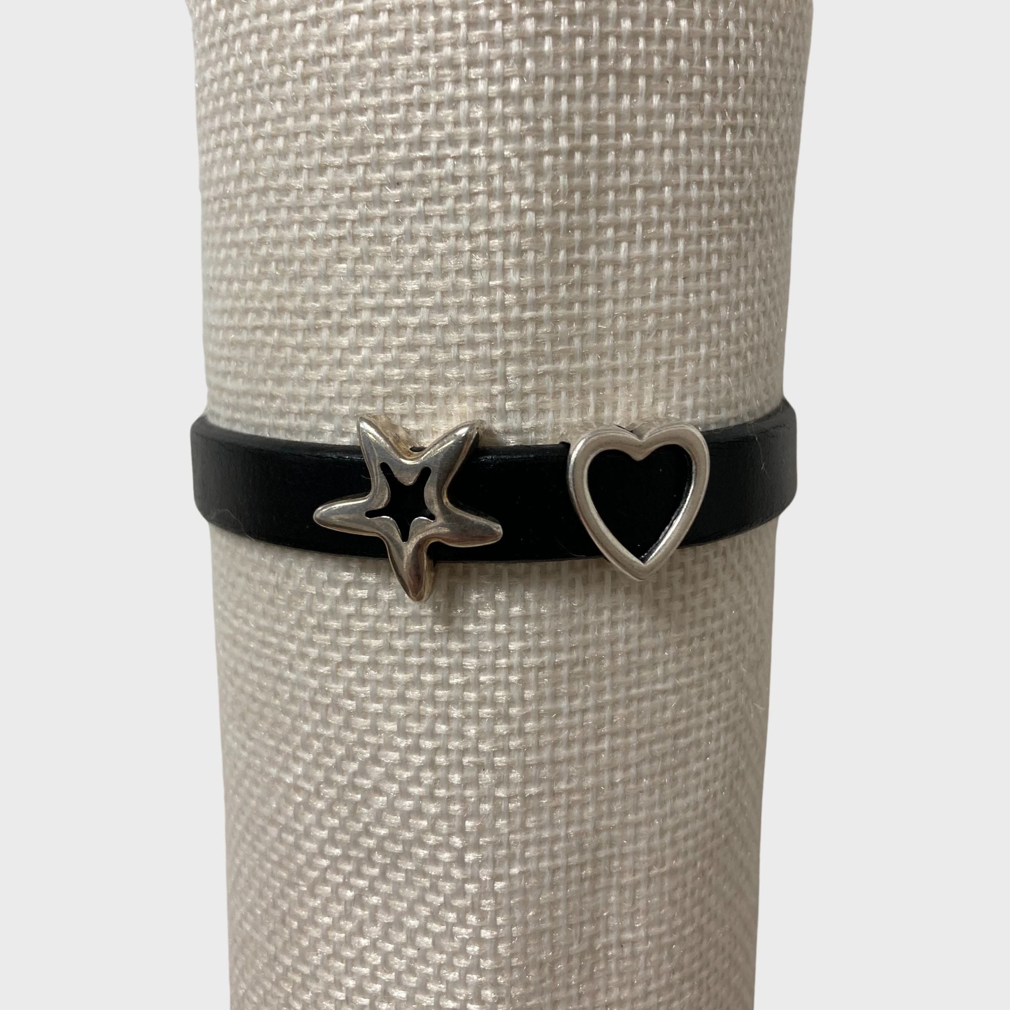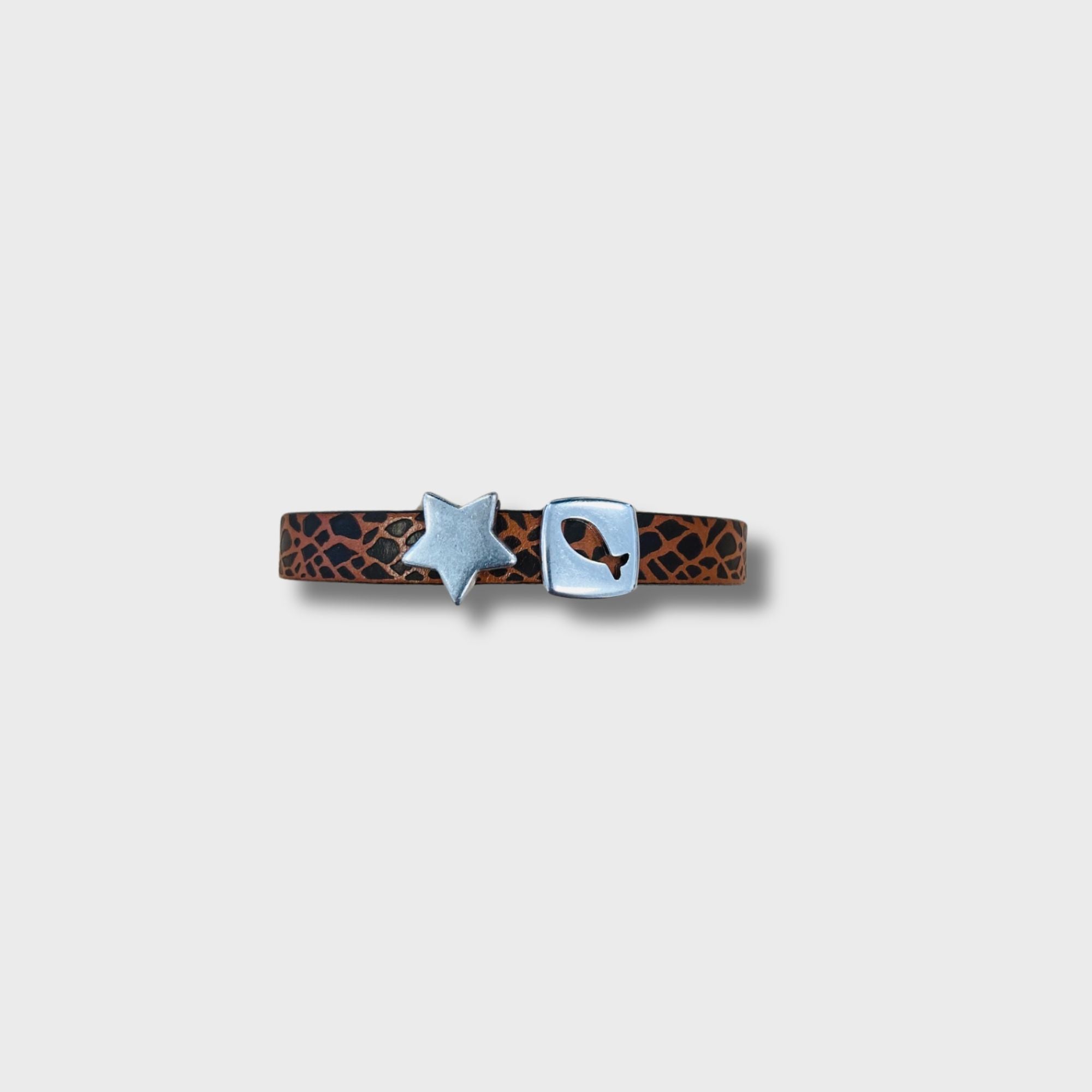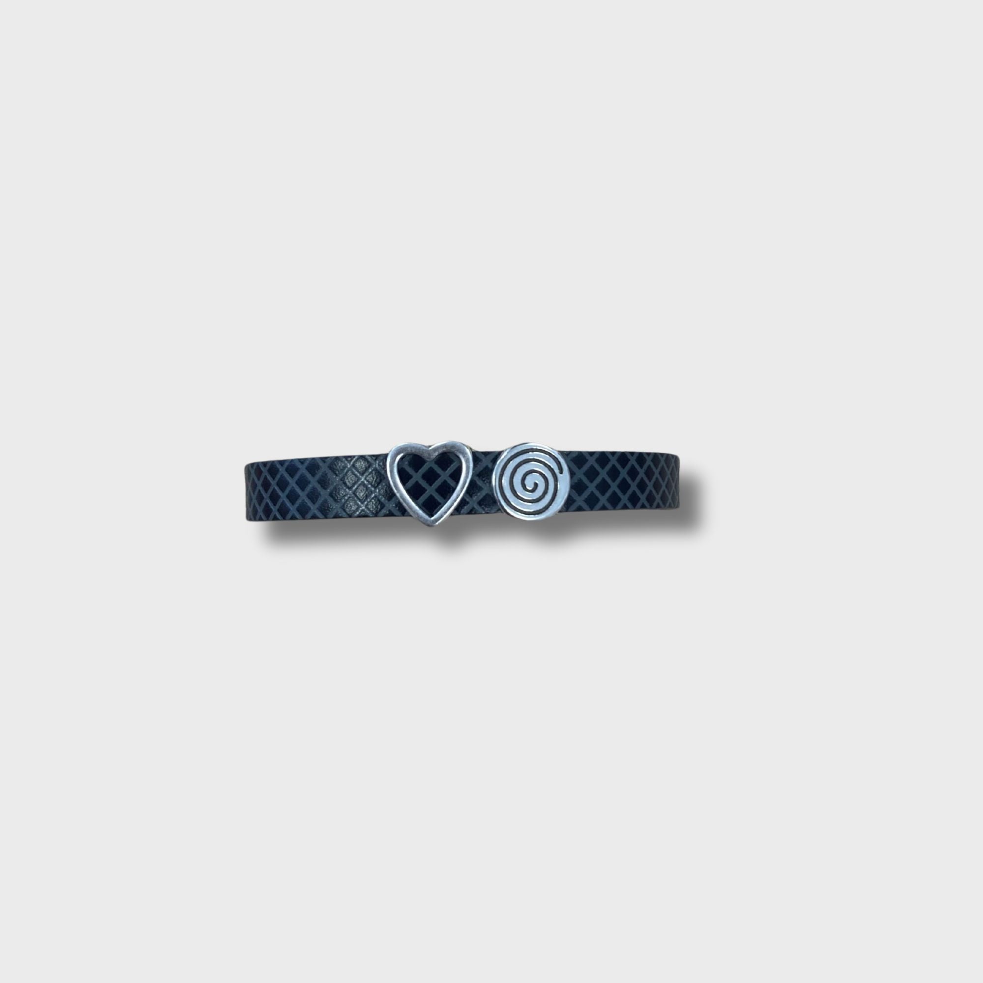 Tira de piel de varios colores y texturas a escoger de 1cm de grosor, con 2 detalles a escoger en plata de entre 1cm y 3cm aprox. Contactar para hacer las combinaciones necesarias. Ajustable a la muñeca con cierre metálico.