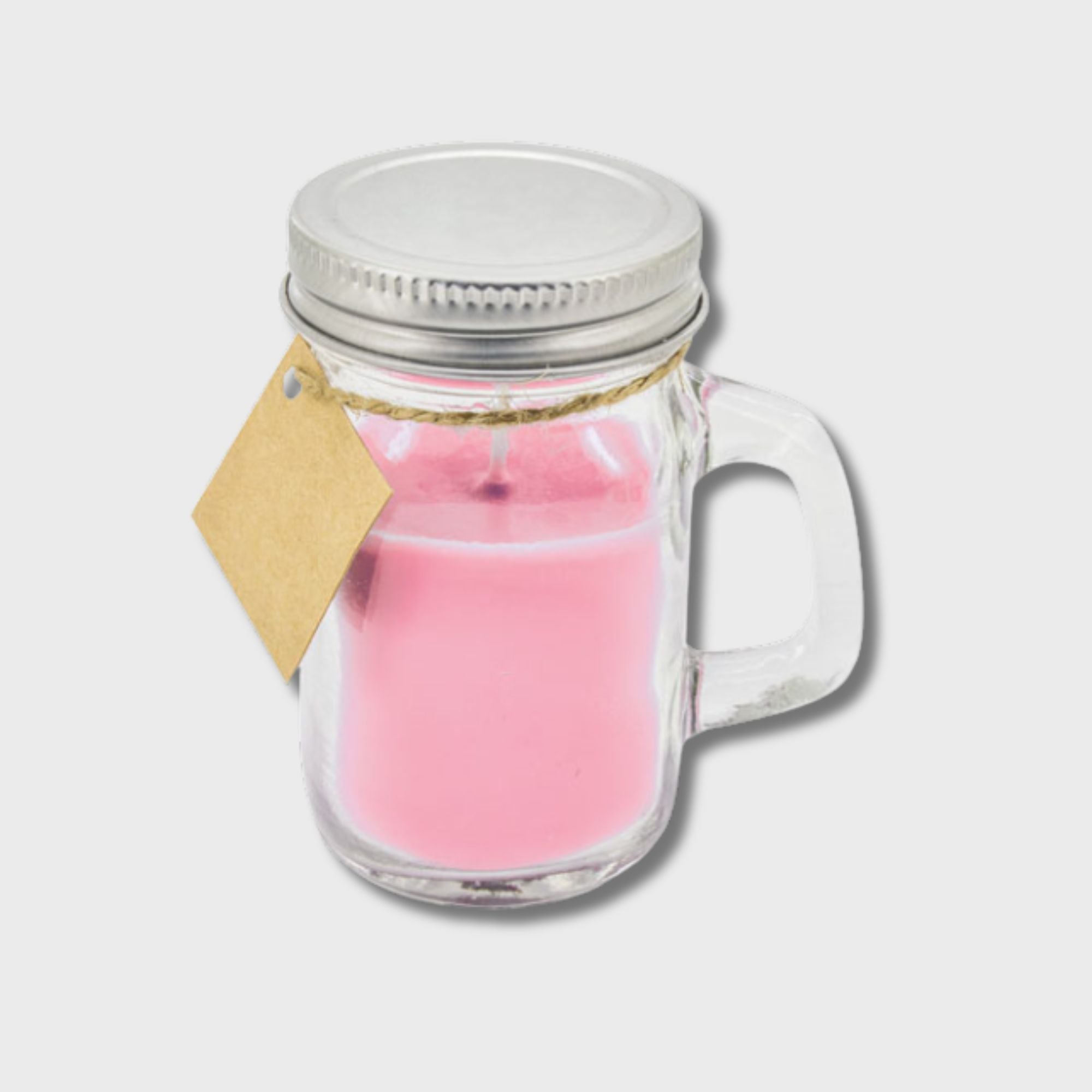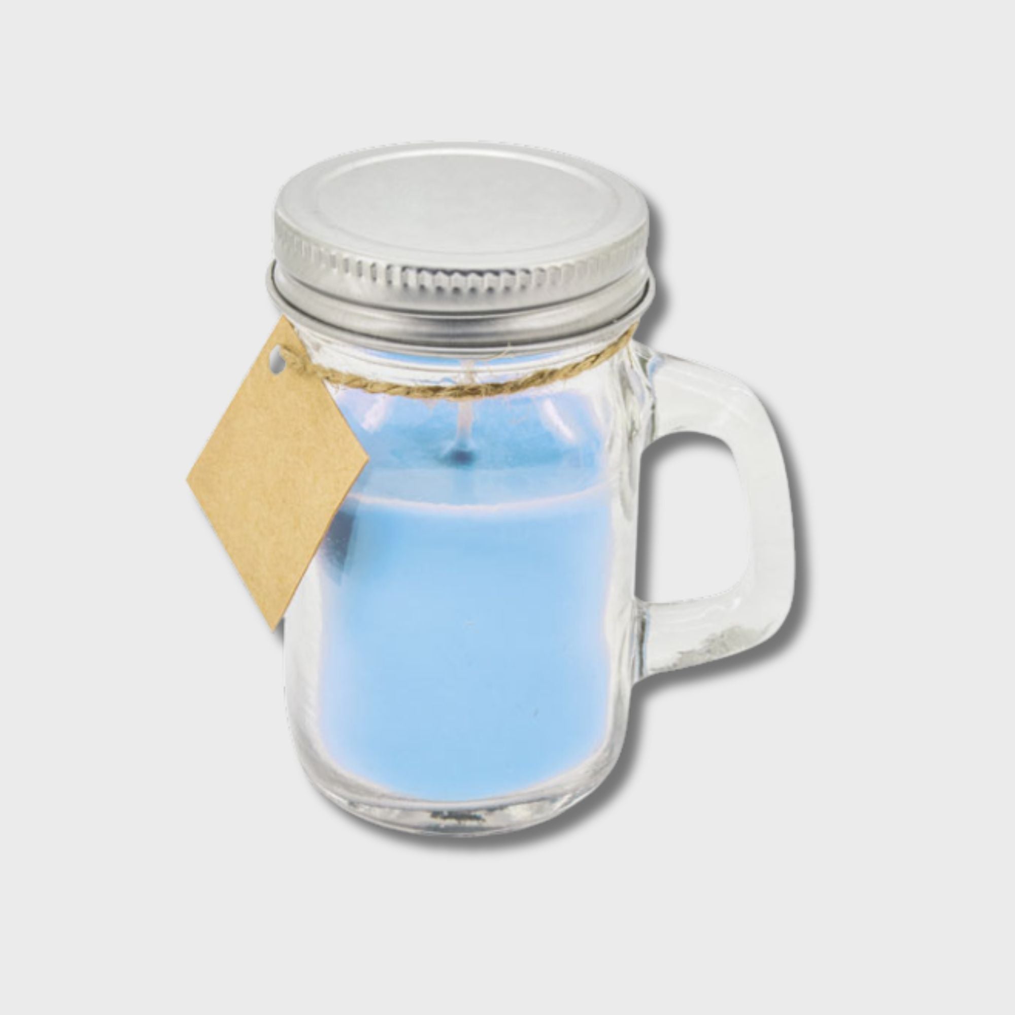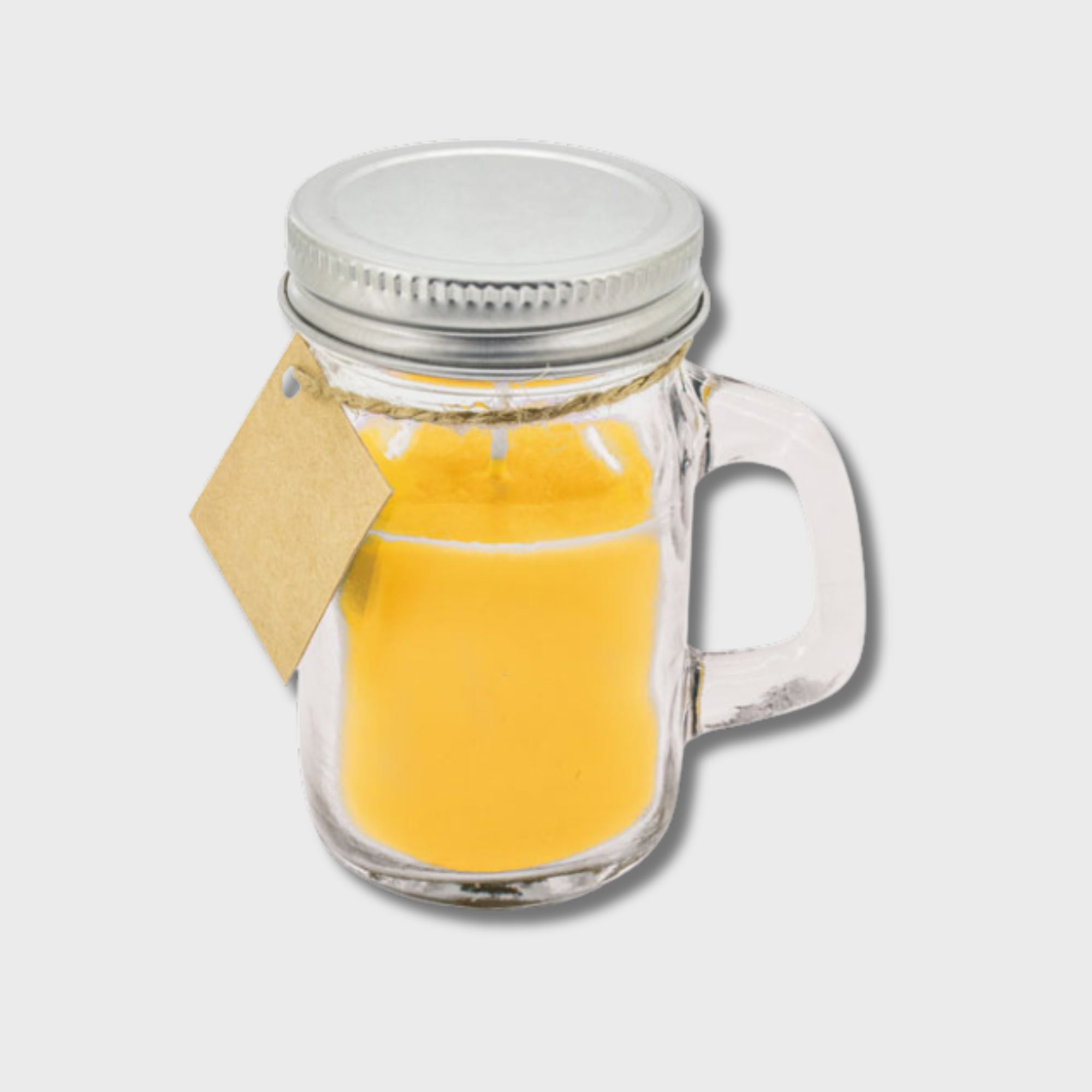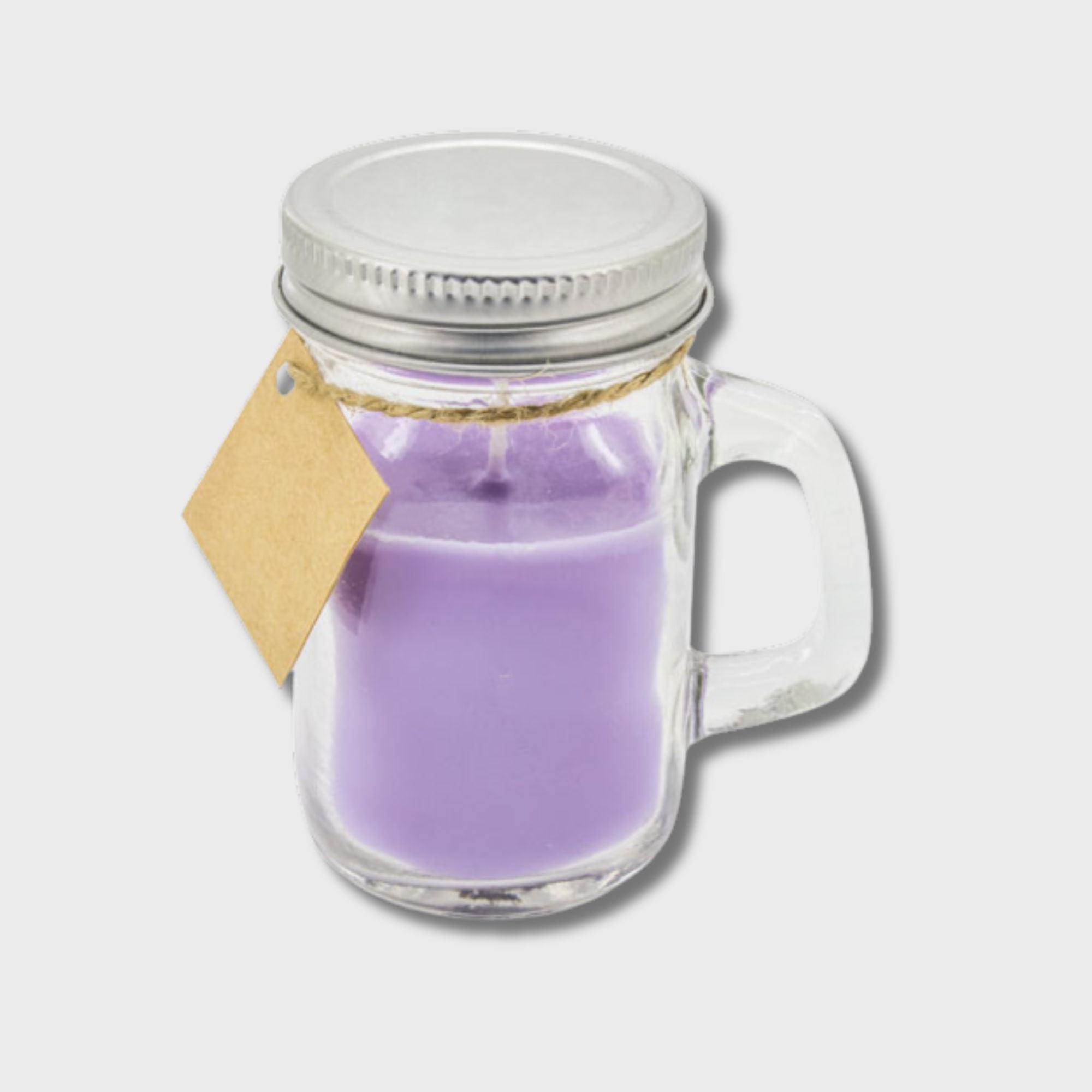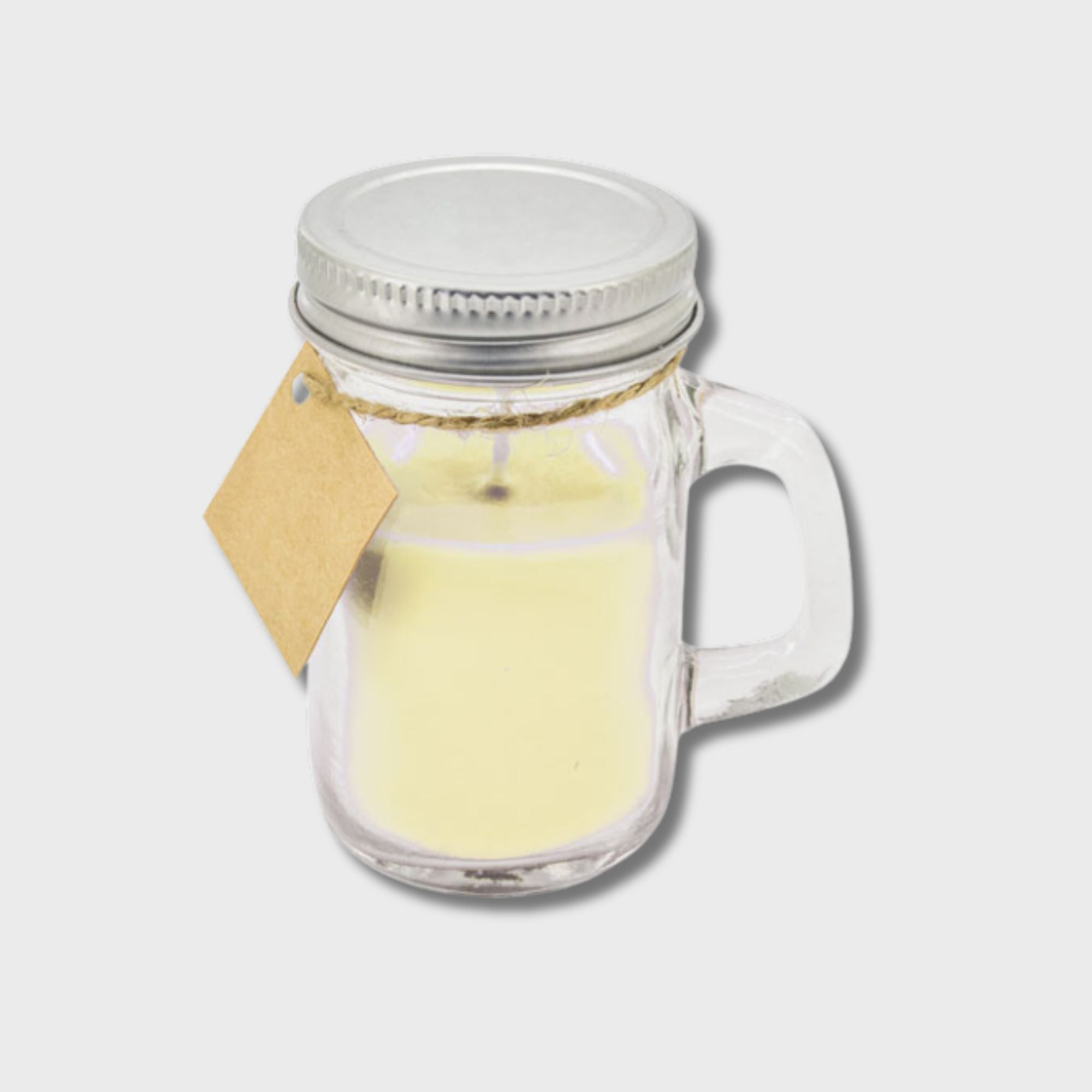 Vela con aroma presentada en una jarrita de cristal con asa y una tapa metálica, de medidas 5x8.5cm. Área de marcaje con láser 4.5cm de diámetro.