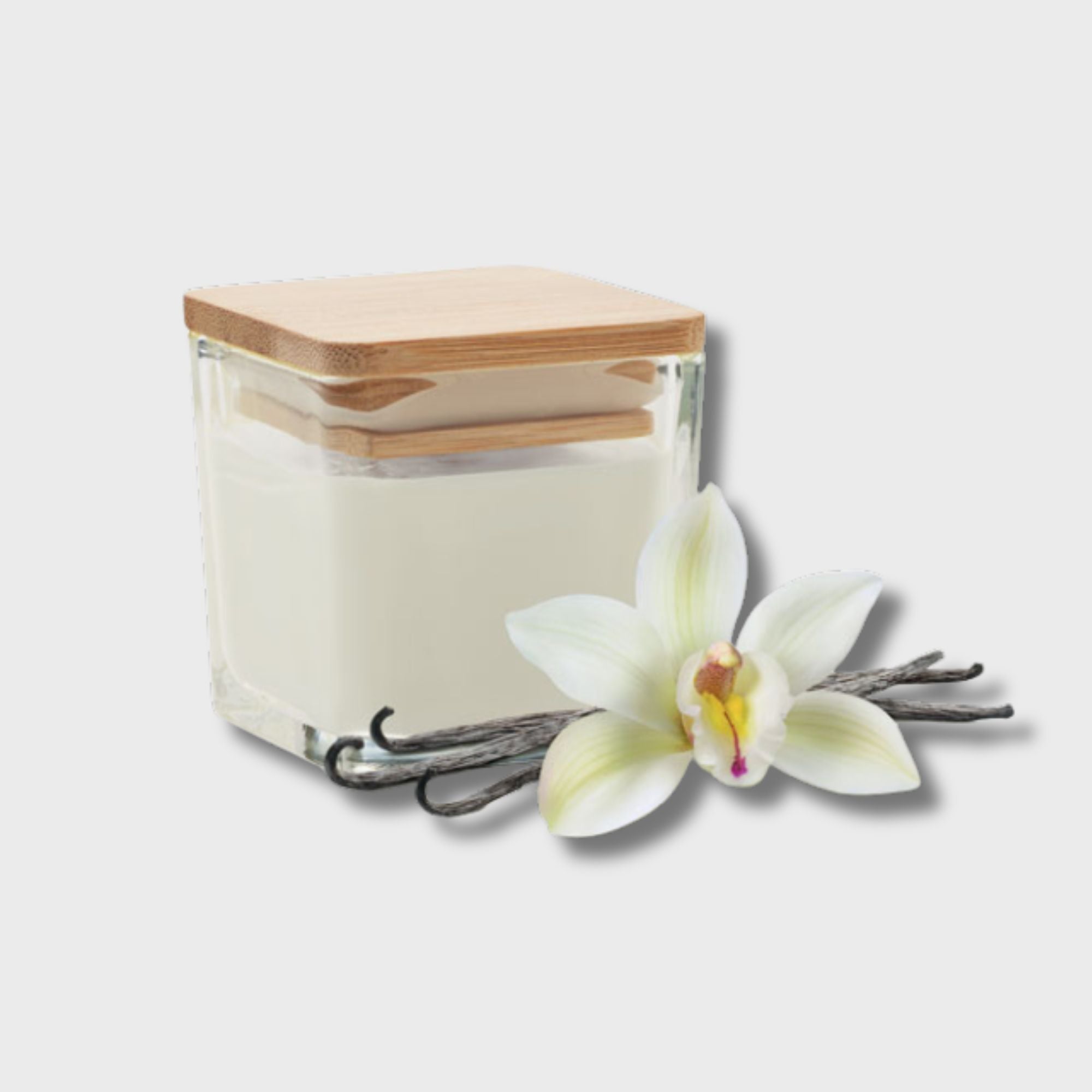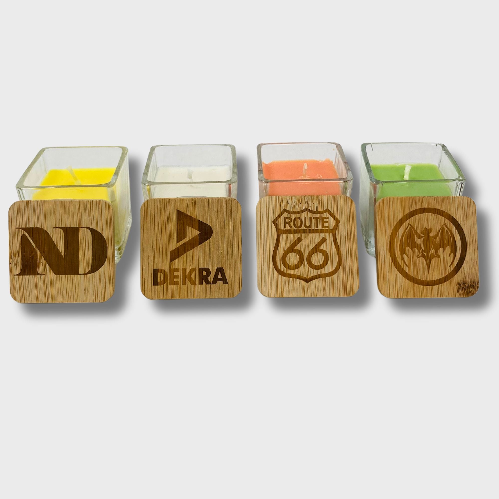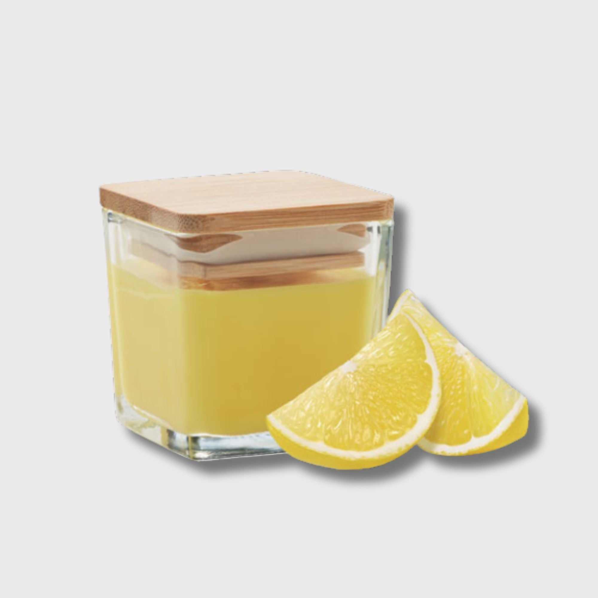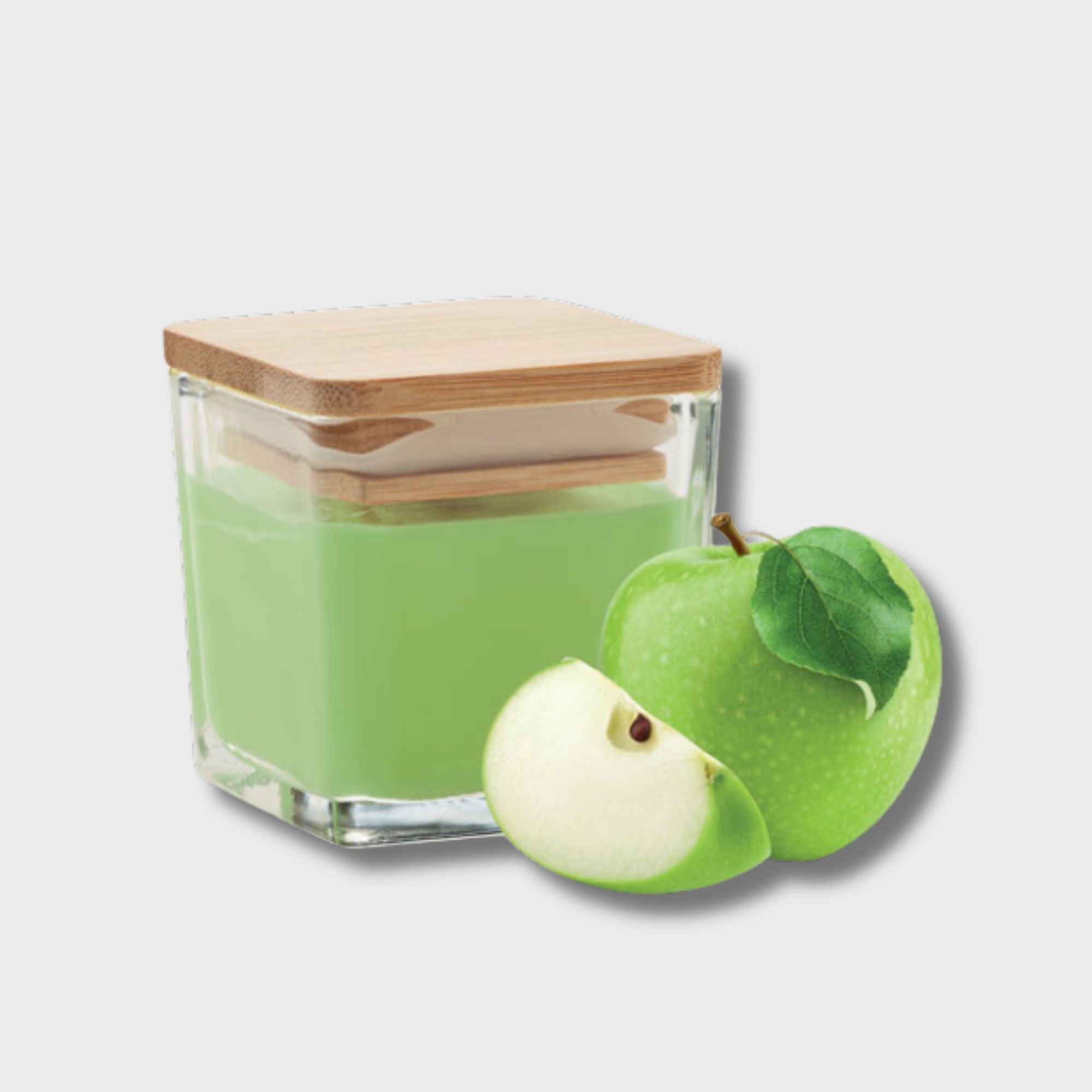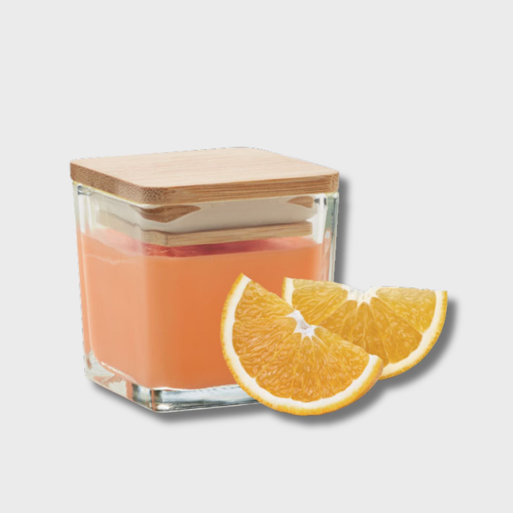 Vela de cera aromatizada a base de plantas en envase de cristal cuadrado con tapa de bambú. 50 gr. Disponible en 4 fragancias (Blanco/vainilla, amarillo/limón, naranja/naranja, verde/manzana).Tiempo de combustión: 8 horas.