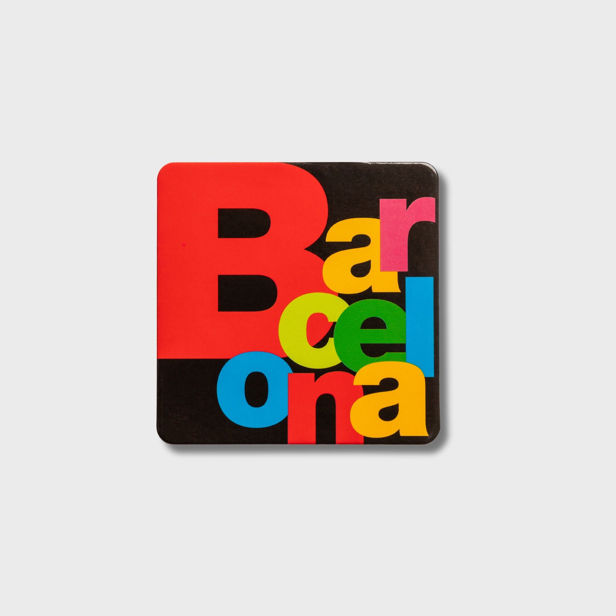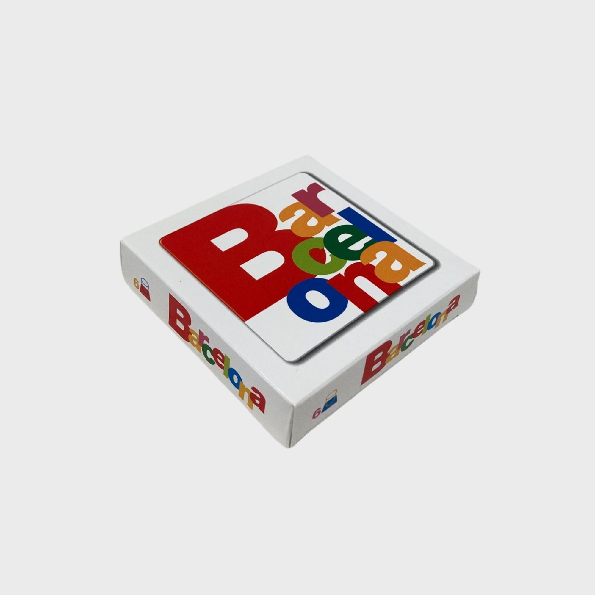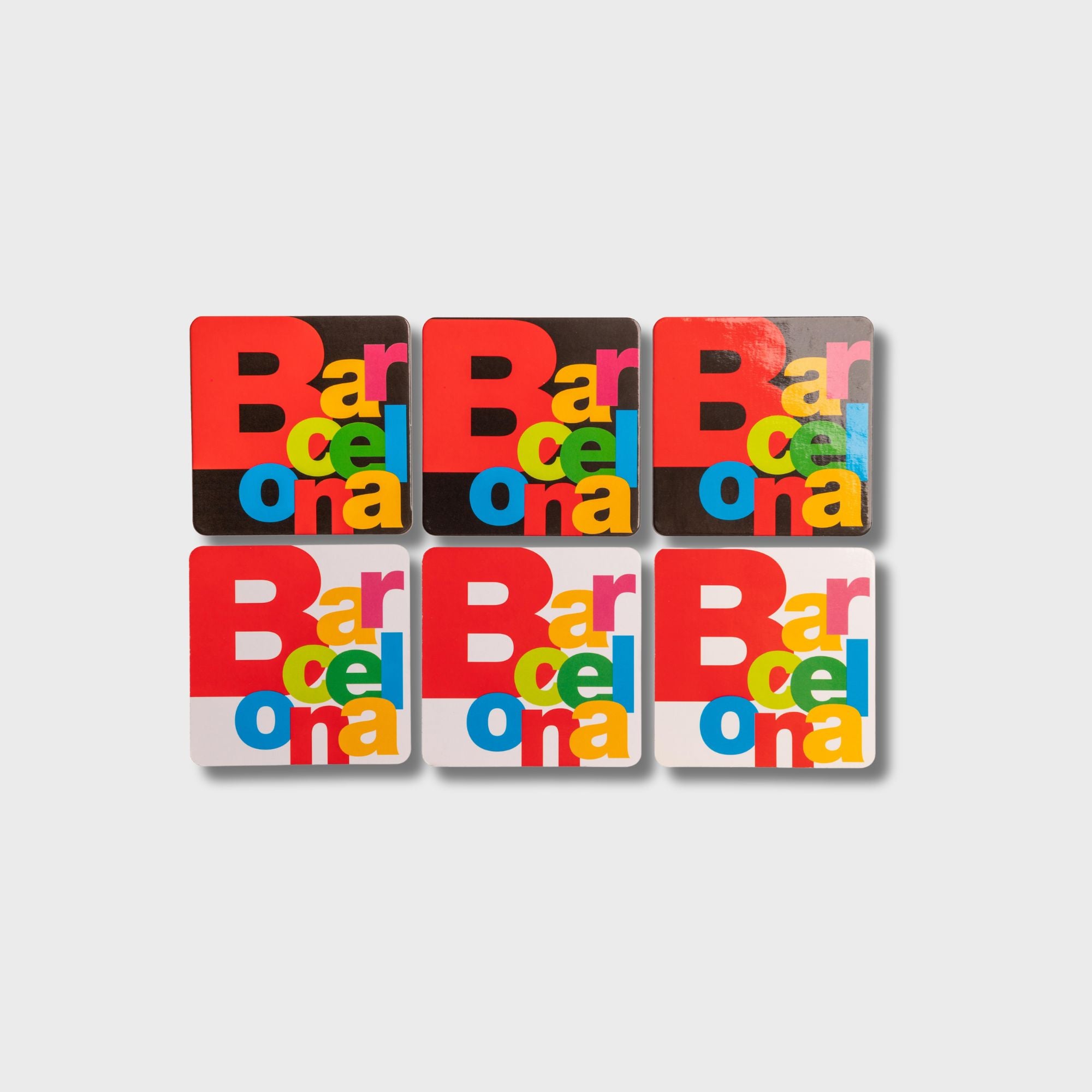 Juego 6 posavasos a doble cara, cuadrados, de medida 9cm x 9cm con las letras de Barcelona con fondo blanco por un lado y negro por el otro.