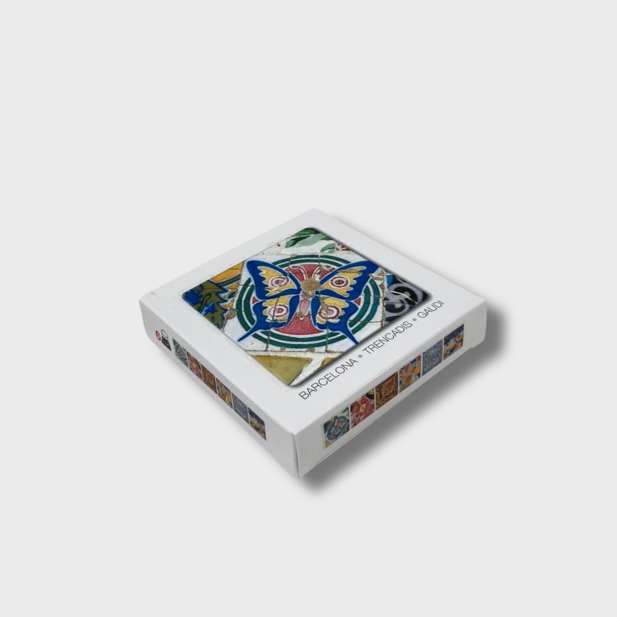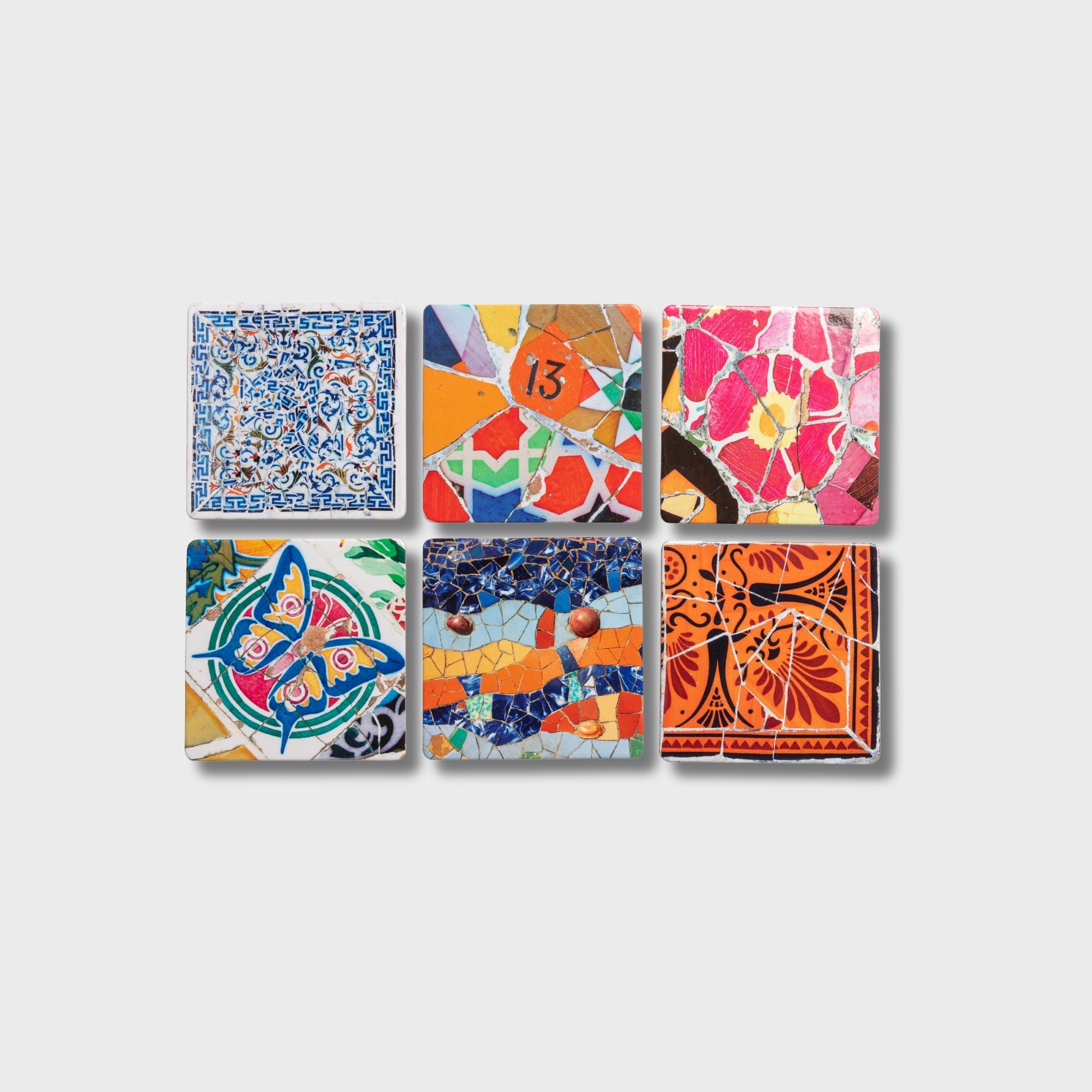 Juego 6 posavasos a doble cara, cuadrados, de medida 9cm x 9cm con imágenes de mosaicos variados.