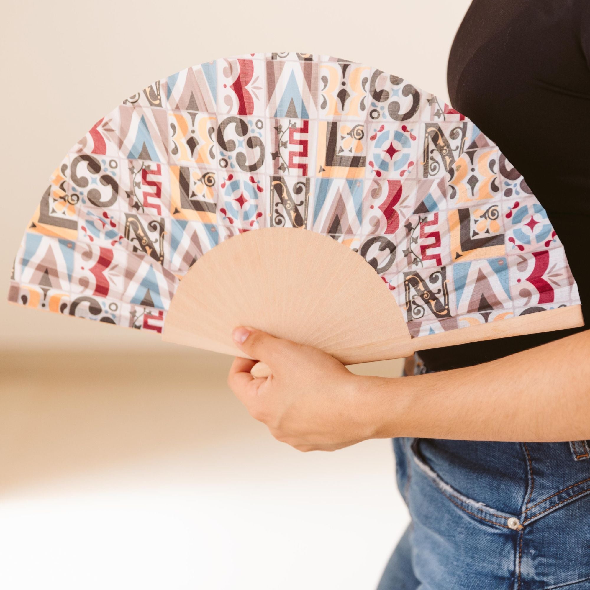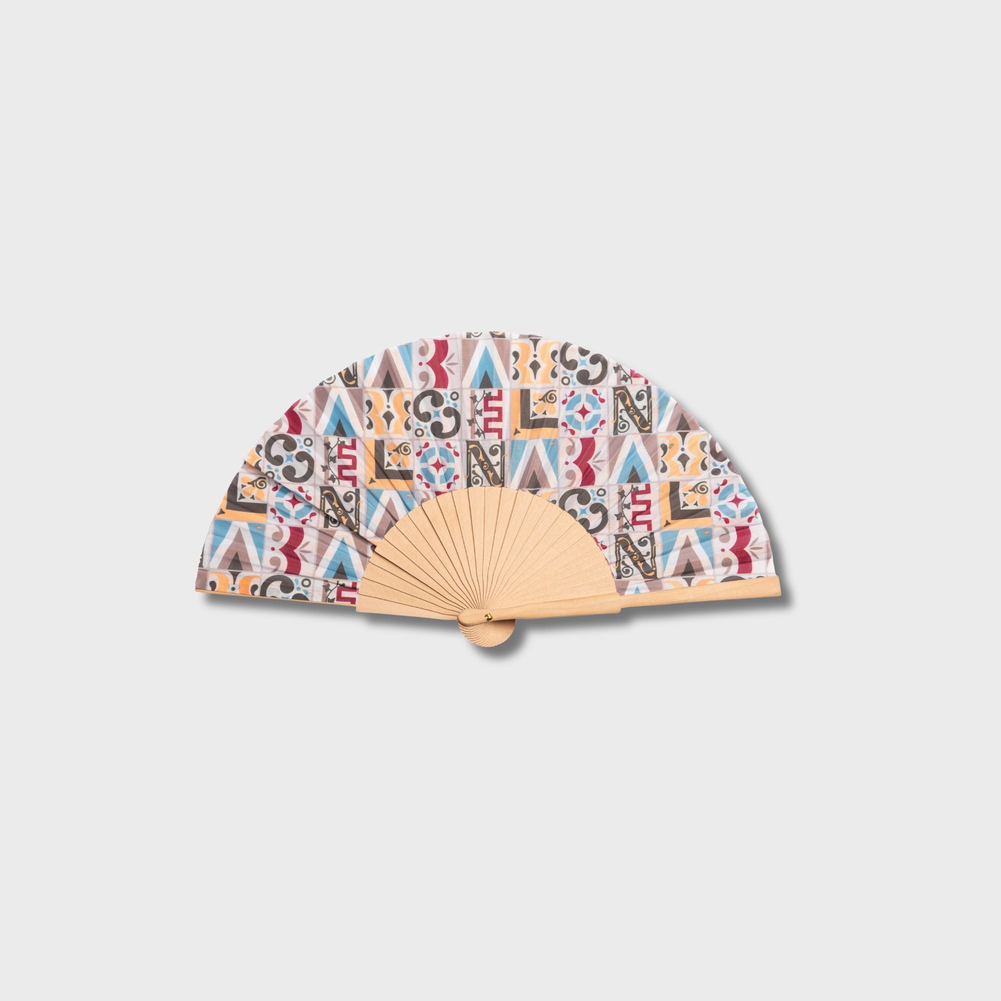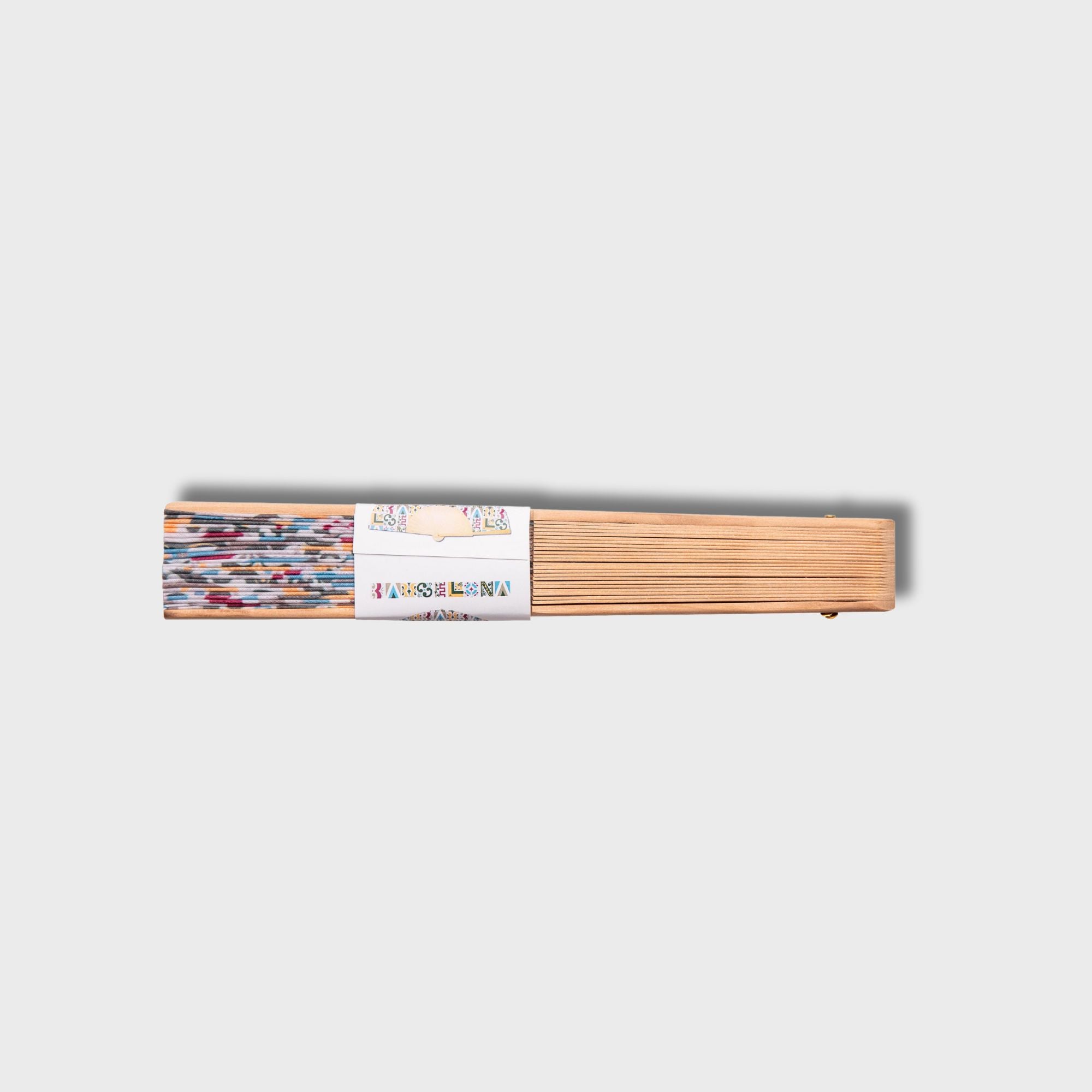 Abanico de madera natural estampado a una cara en tela de primera calidad, tiene 24 varillas y sus medidas son 23 cms plegado y 42 cm abierto.