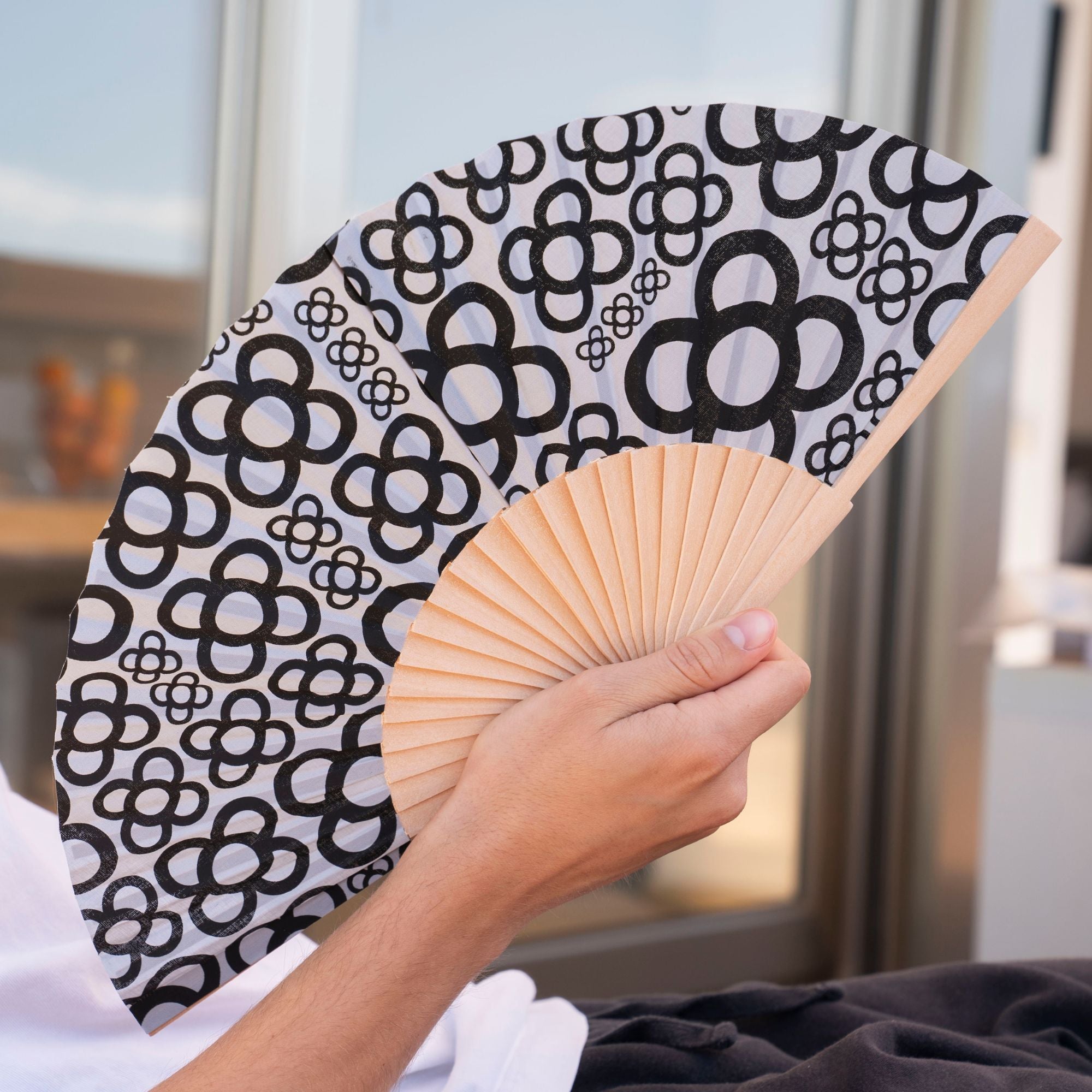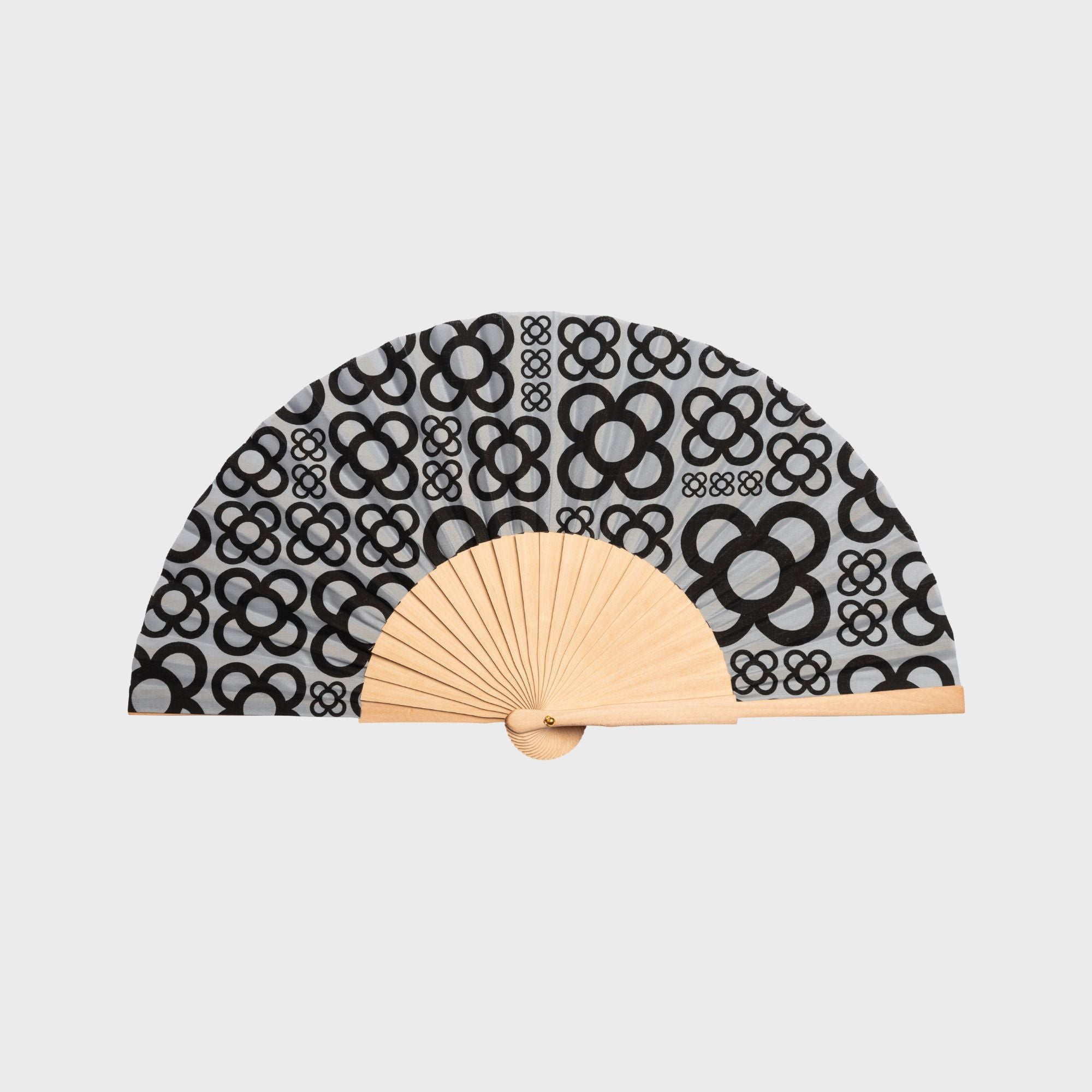 Abanico de madera natural estampado a una cara en tela de primera calidad, tiene 24 varillas y sus medidas son 23 cms plegado y 42 cm abierto.