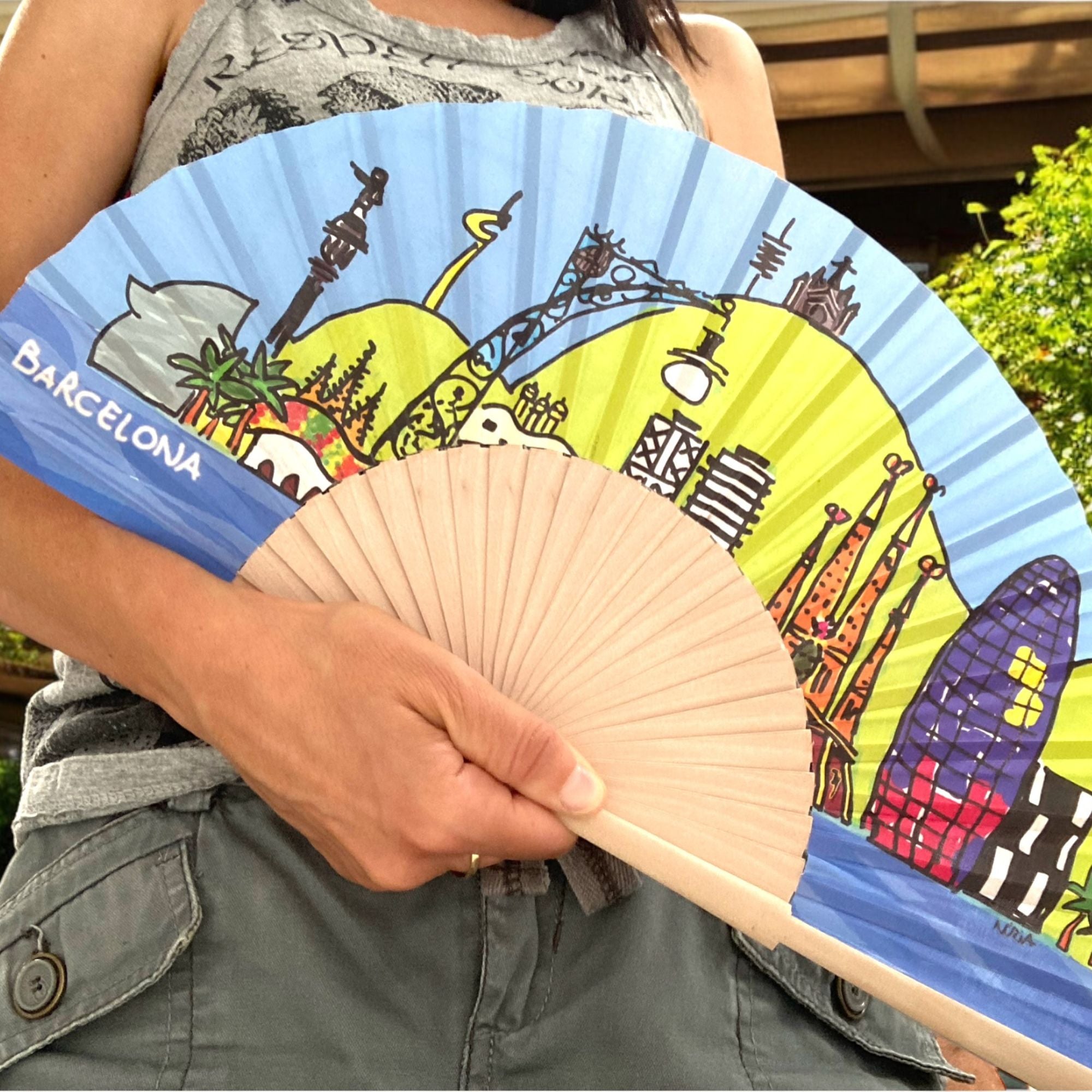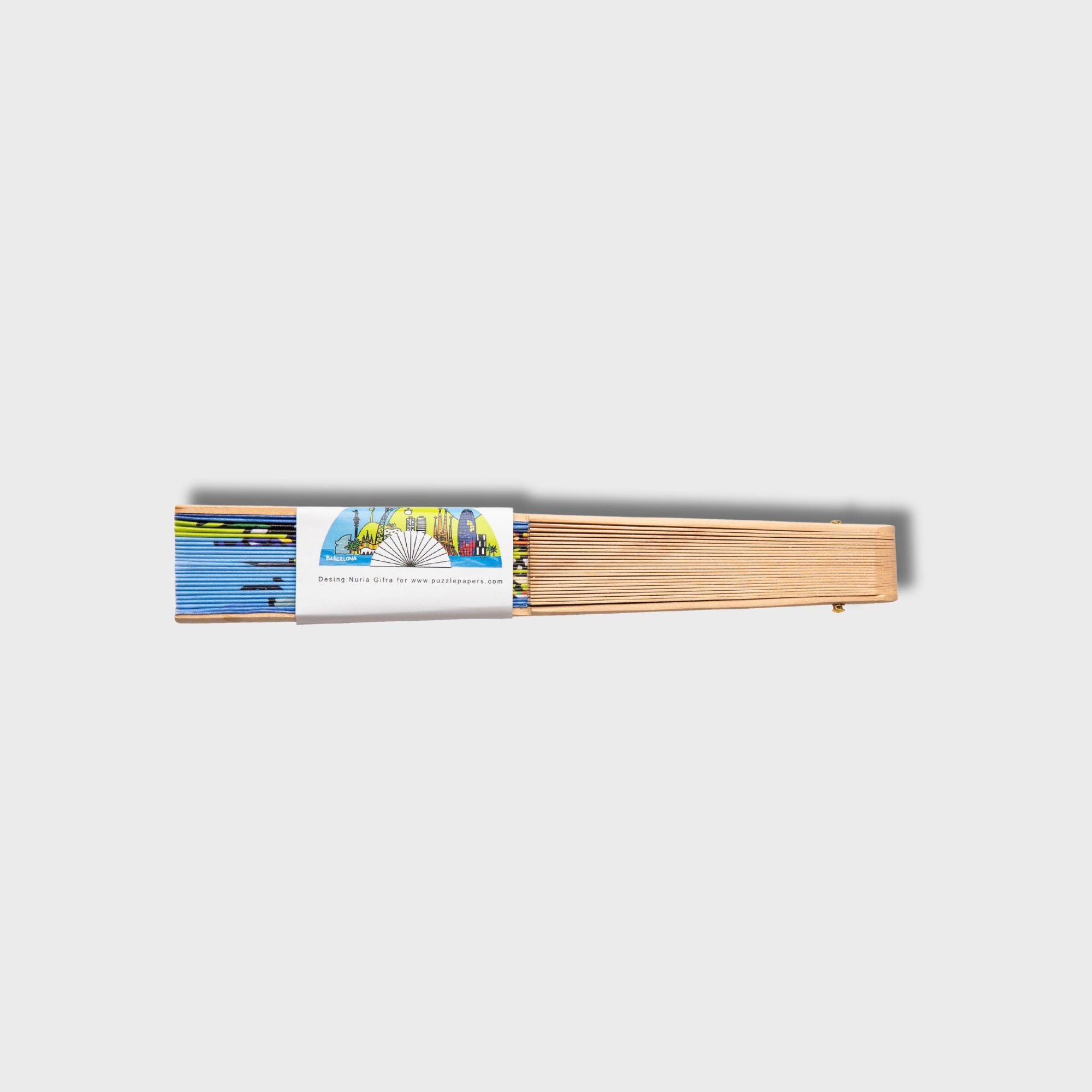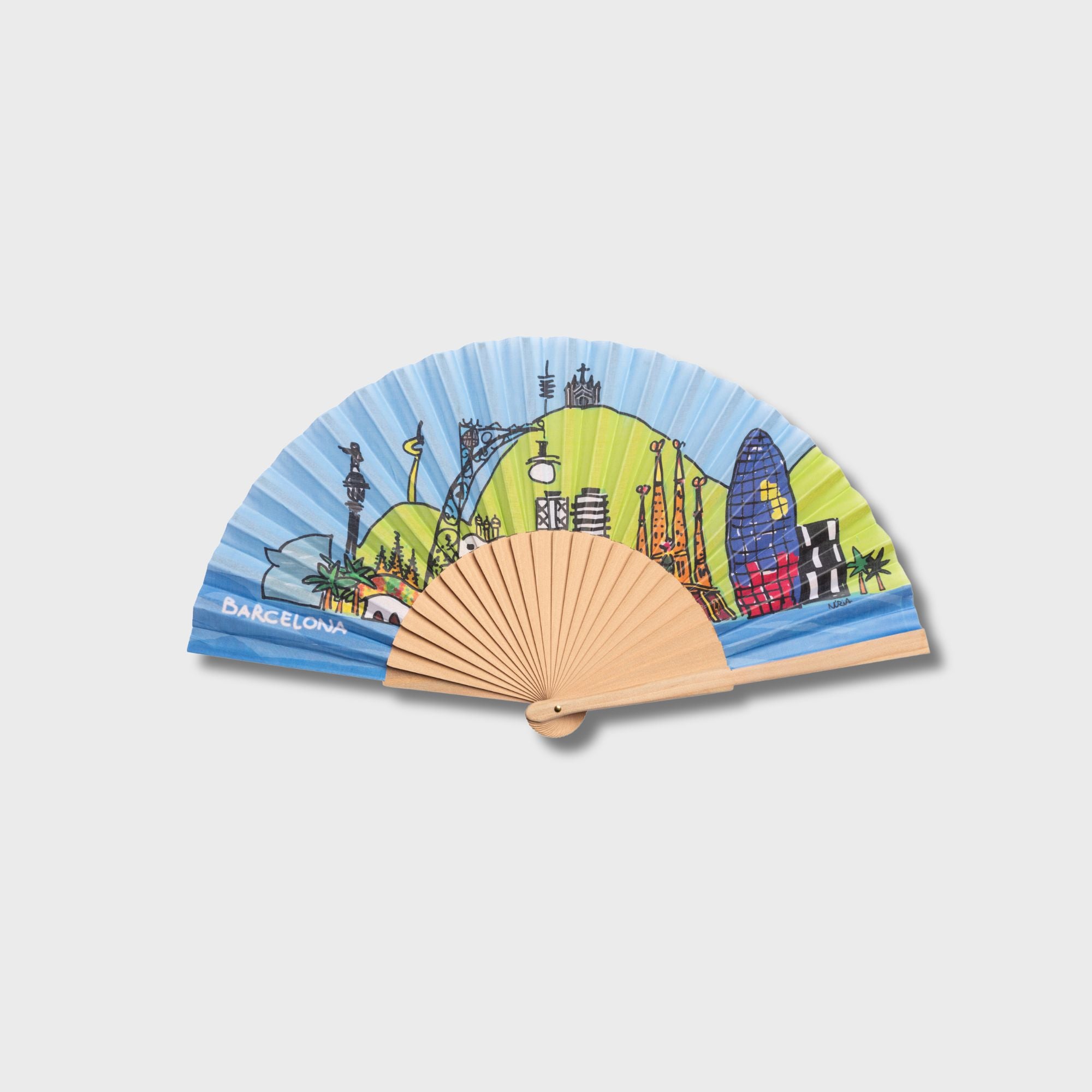 Abanico de madera natural estampado a una cara en tela de primera calidad, tiene 24 varillas y sus medidas son 23 cms plegado y 42 cm abierto.