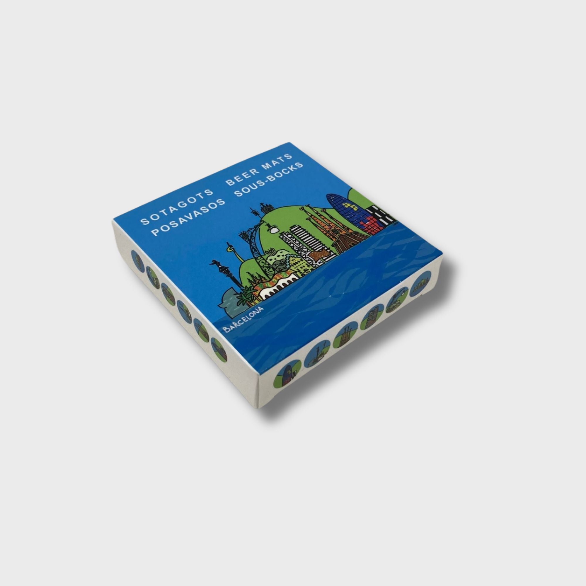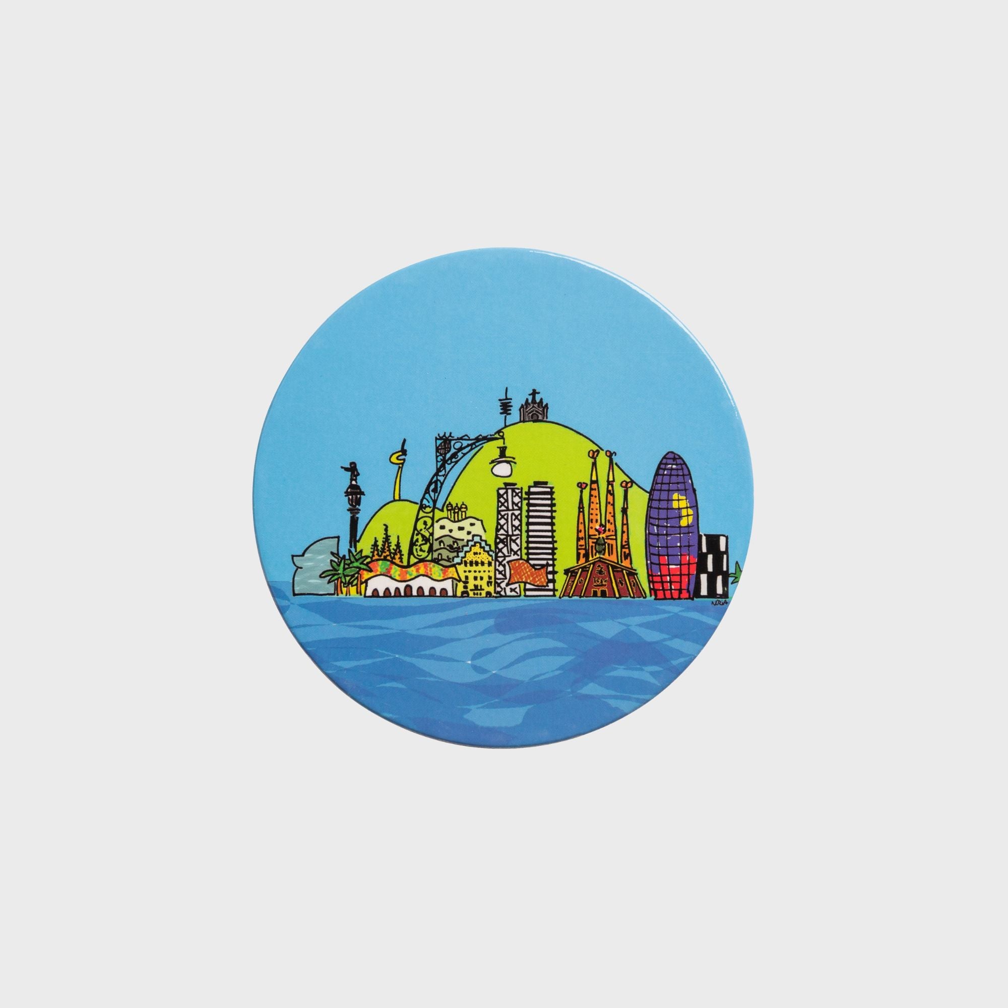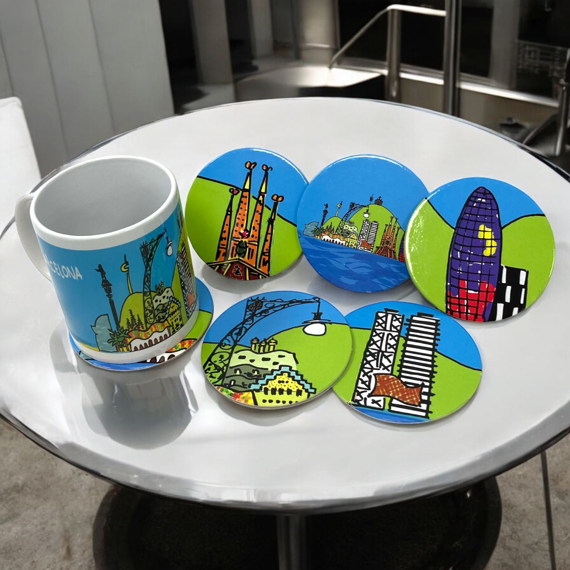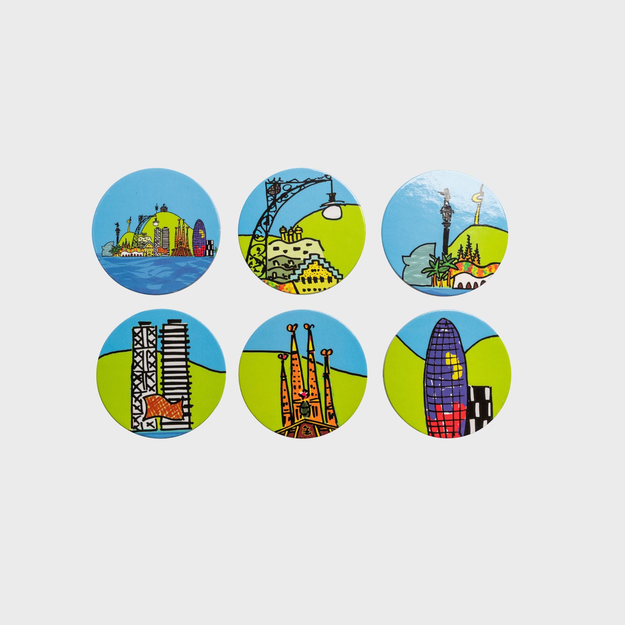 Juego 6 posavasos a doble cara, redondos, de medida 9cm x 9cm con 6 dibujos representativos de Barcelona en colores vivos.