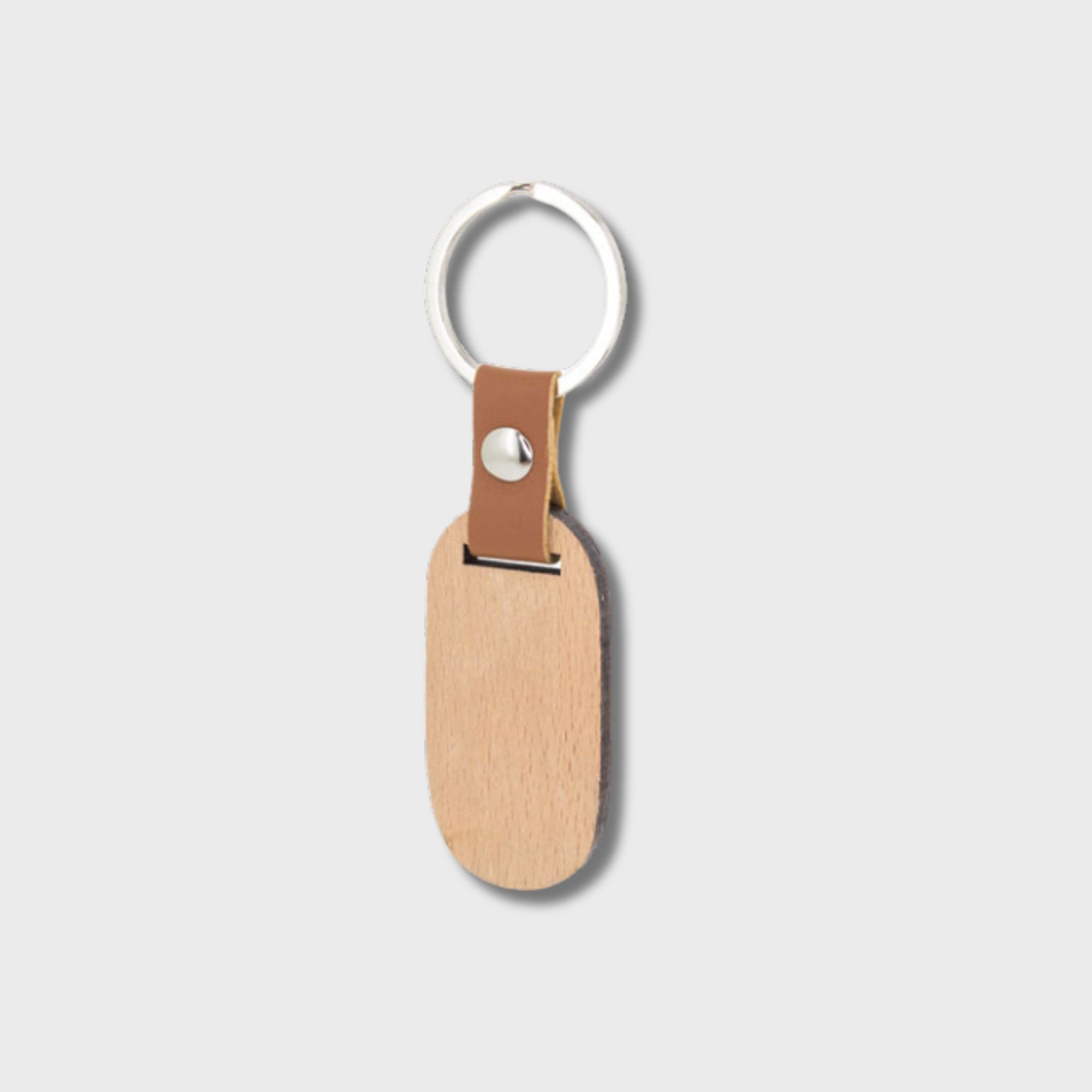 Llavero realizado en madera con detalle en PU y acabados metalizados. Medidas 3.00x10.5cm. Área de marcaje 2x3.5cm.