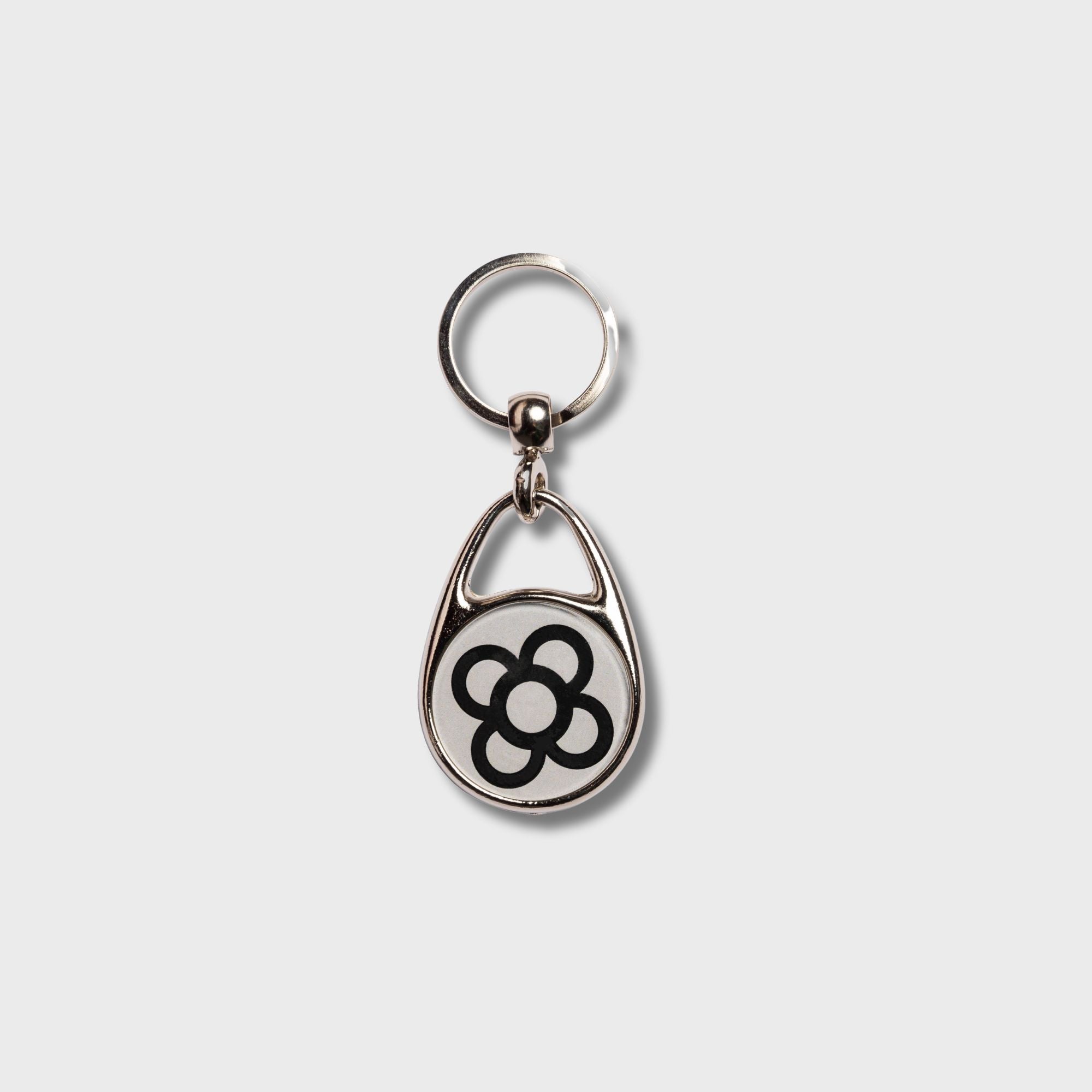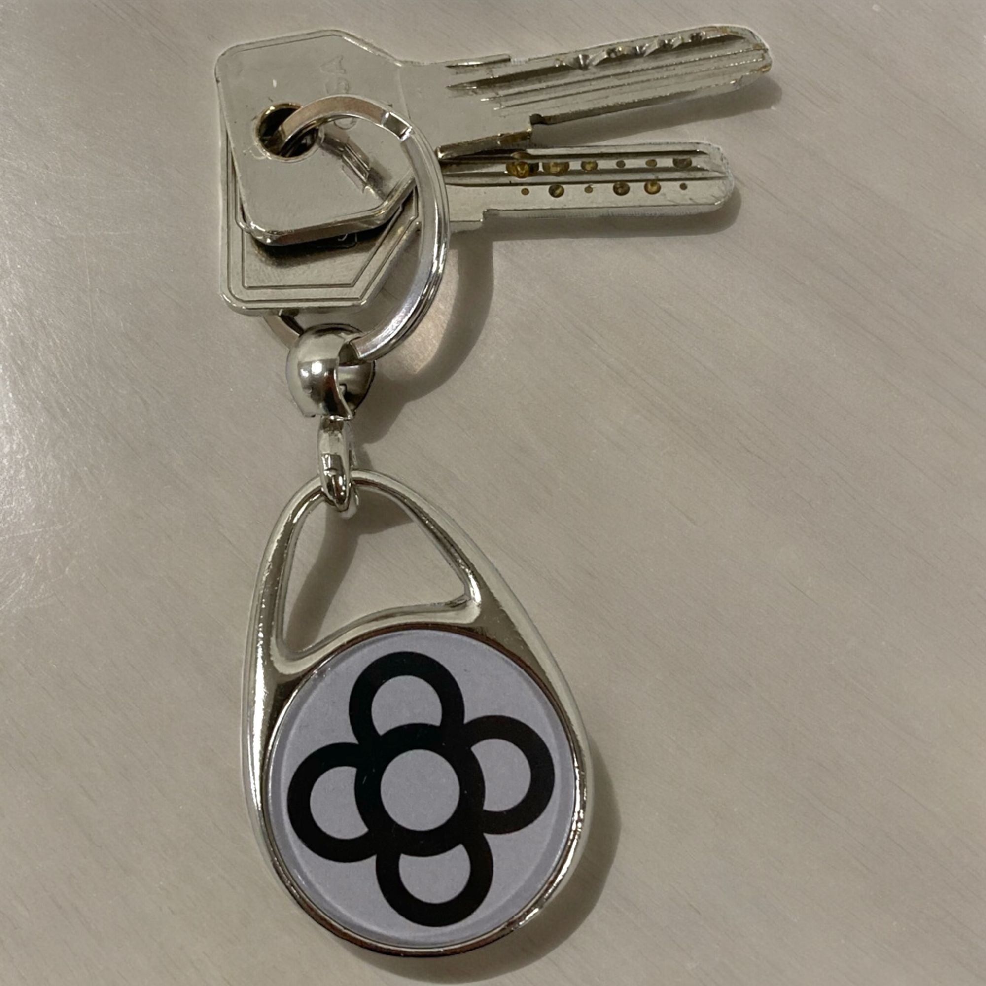 Llavero metálico con forma de gota, muy compacto y líneas curvas con el dibujo a doble cara, de las típicas losetas de Barcelona diseñadas por el arquitecto Josep Puig i Cadafalch.