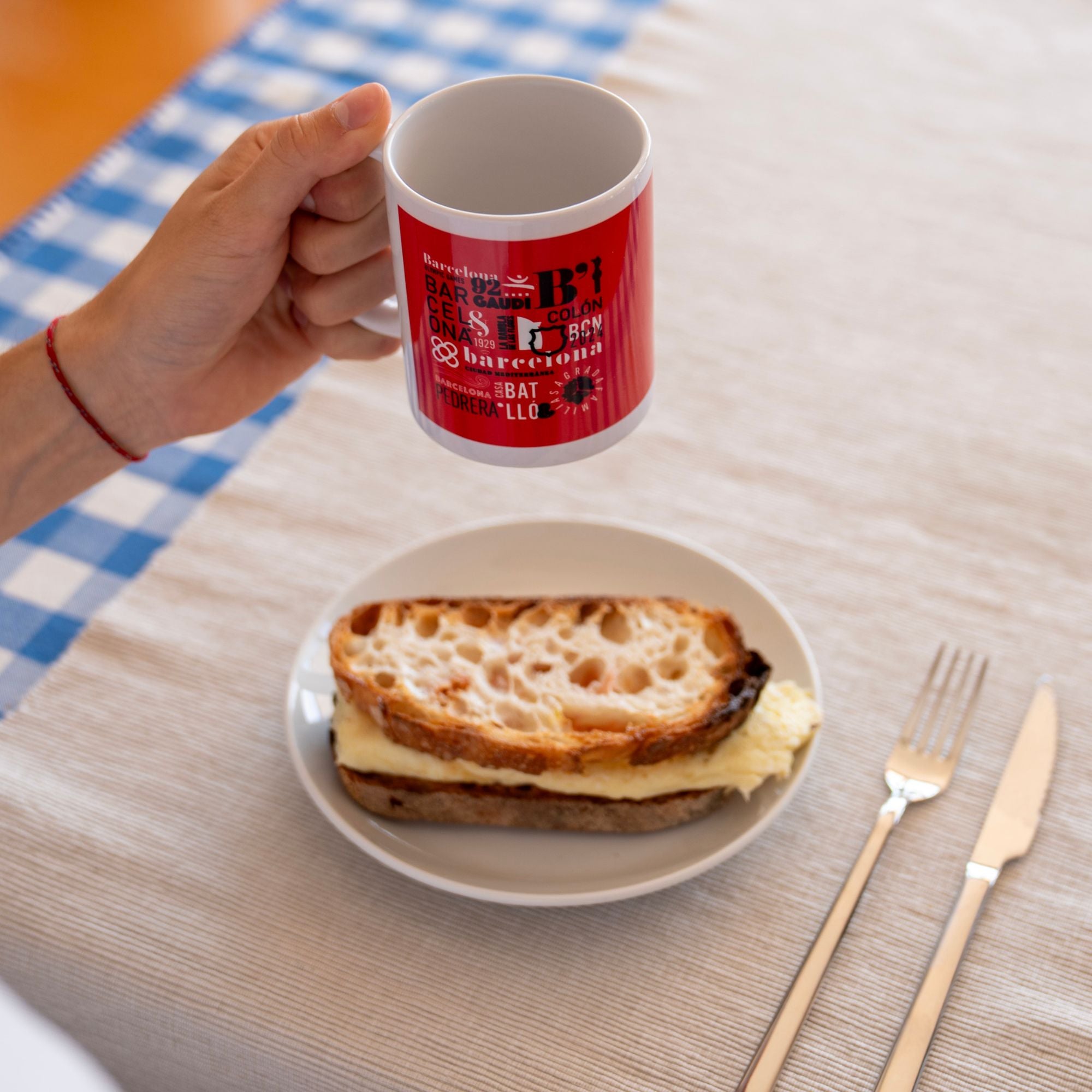 Mug de porcelana de 9,5 cm de alto, de 350ml impresa con fondo blanco.