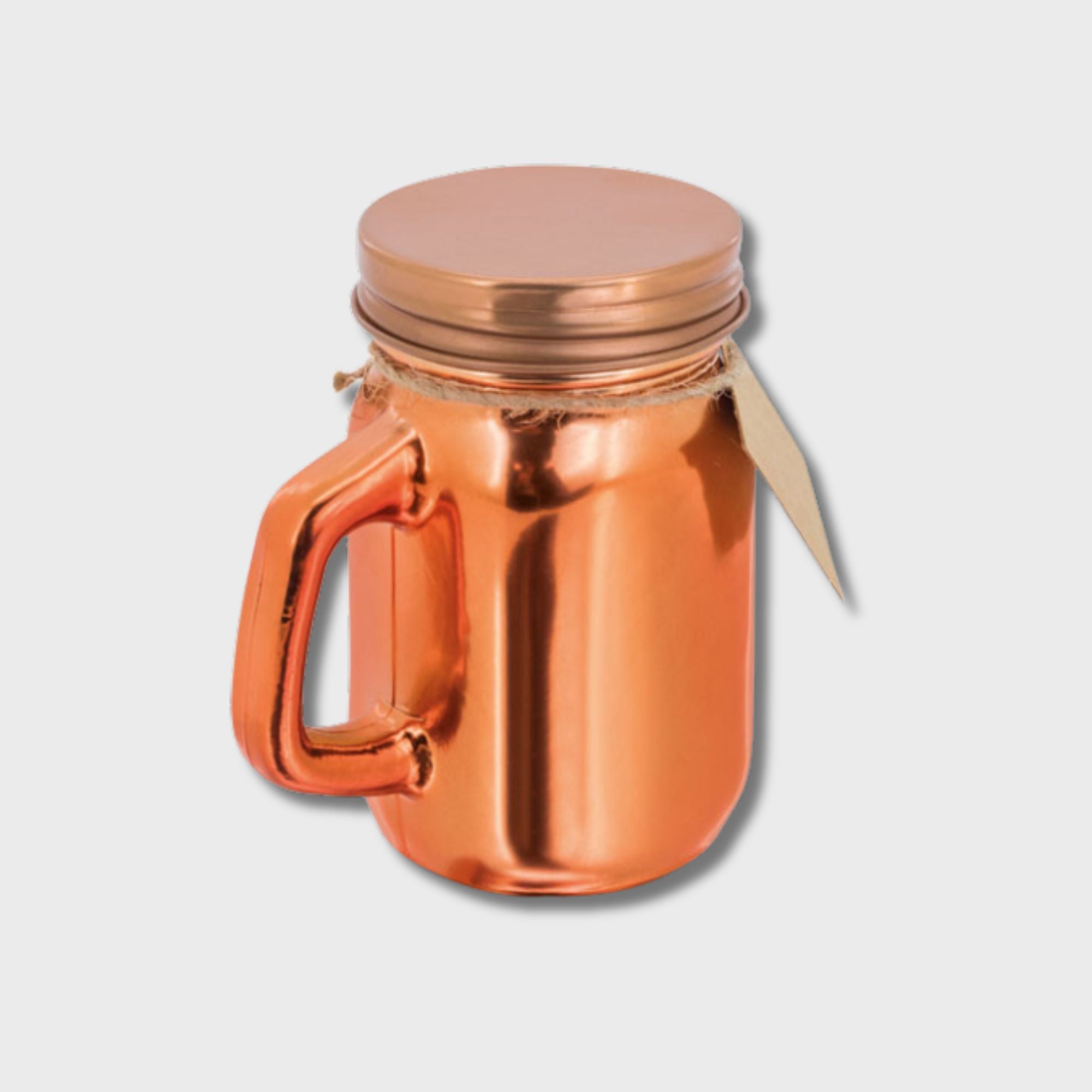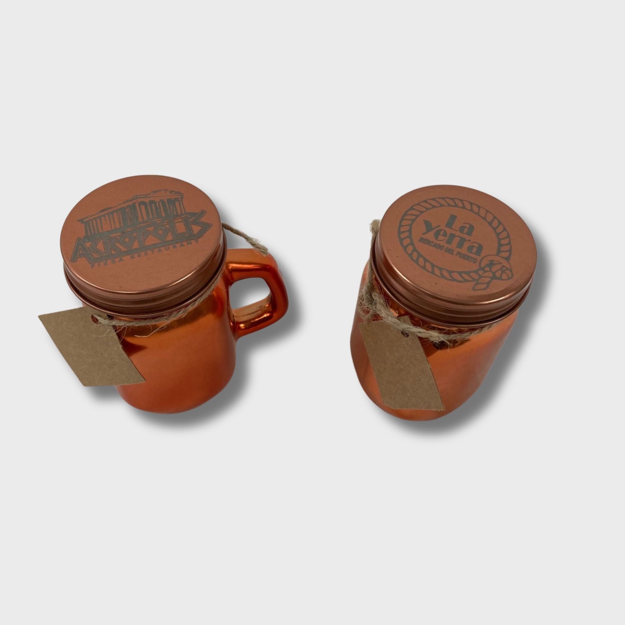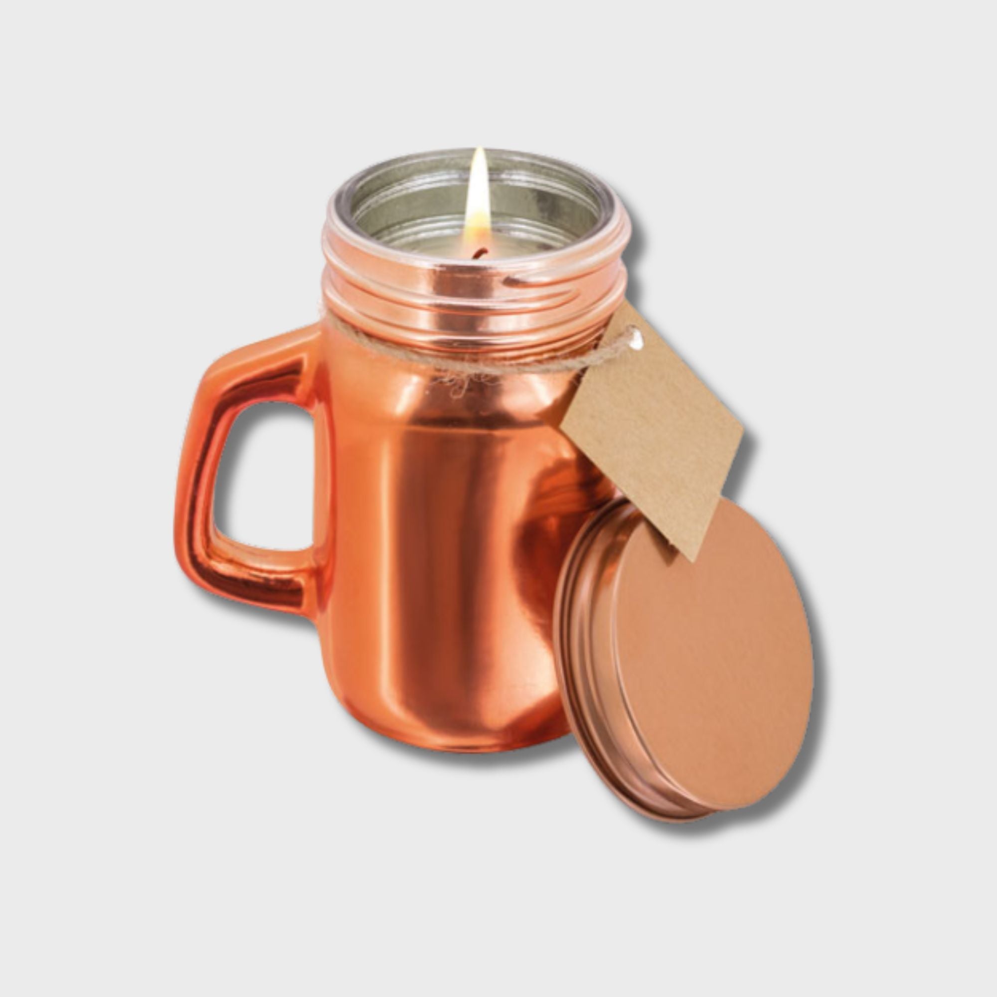 Vela con aroma de canela presentada en una jarrita de cristal con asa pintada y una tapa metálica, de medidas 5x8.5cm. Área de marcaje con láser 4.5cm de diámetro.